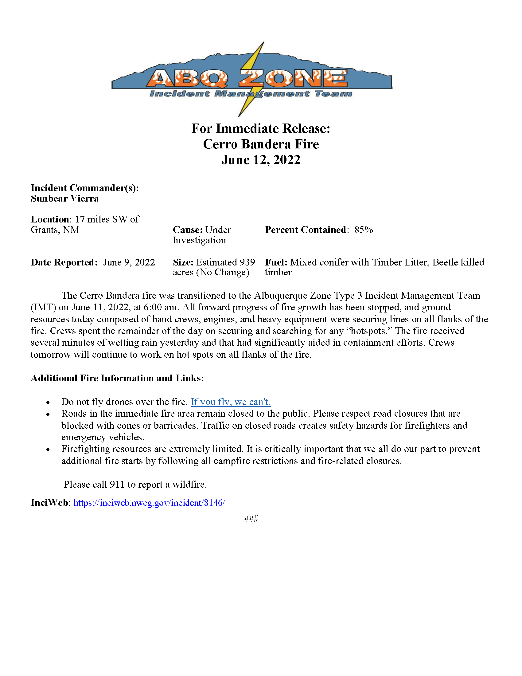 Cerro Bandera Fire 85% Contained – Cibola County – June 12, 2022