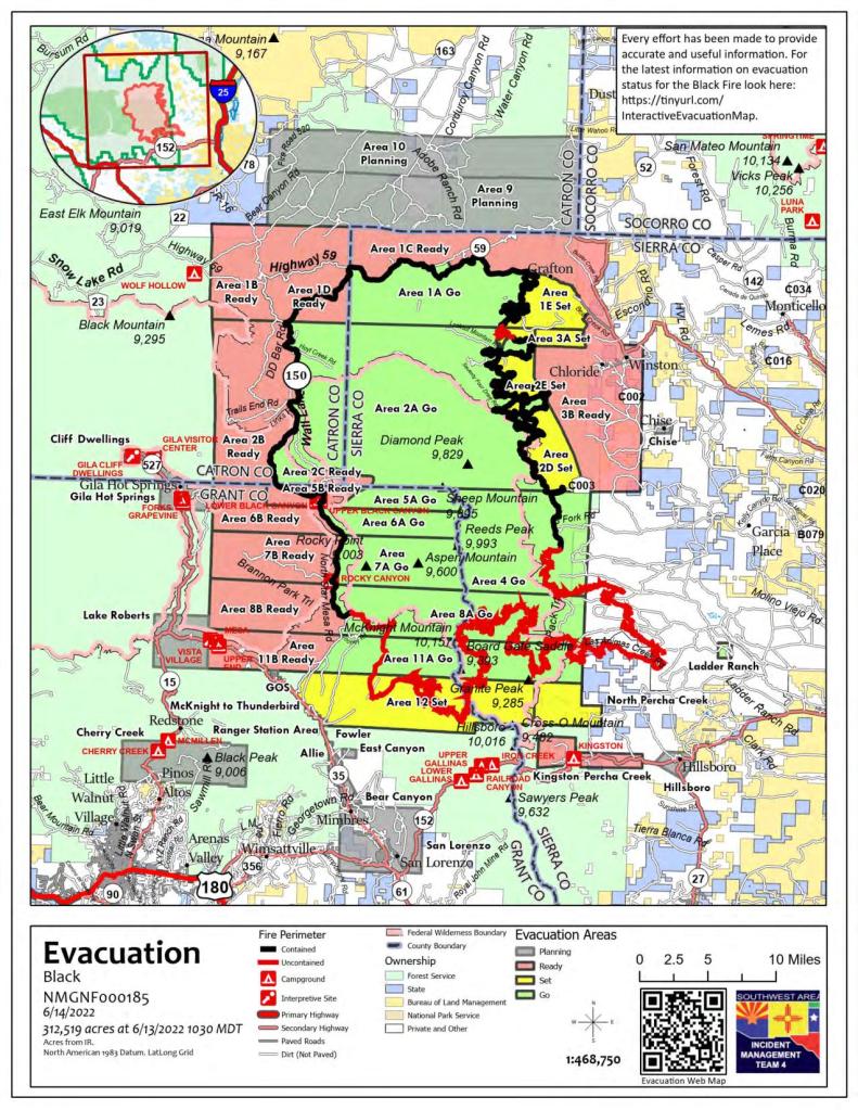 To learn about the current evacuation status for the Black Fire, please access the real-time, interactive evacuation map or contact your local emergency management office for Sierra County, Catron County, and Grant County.