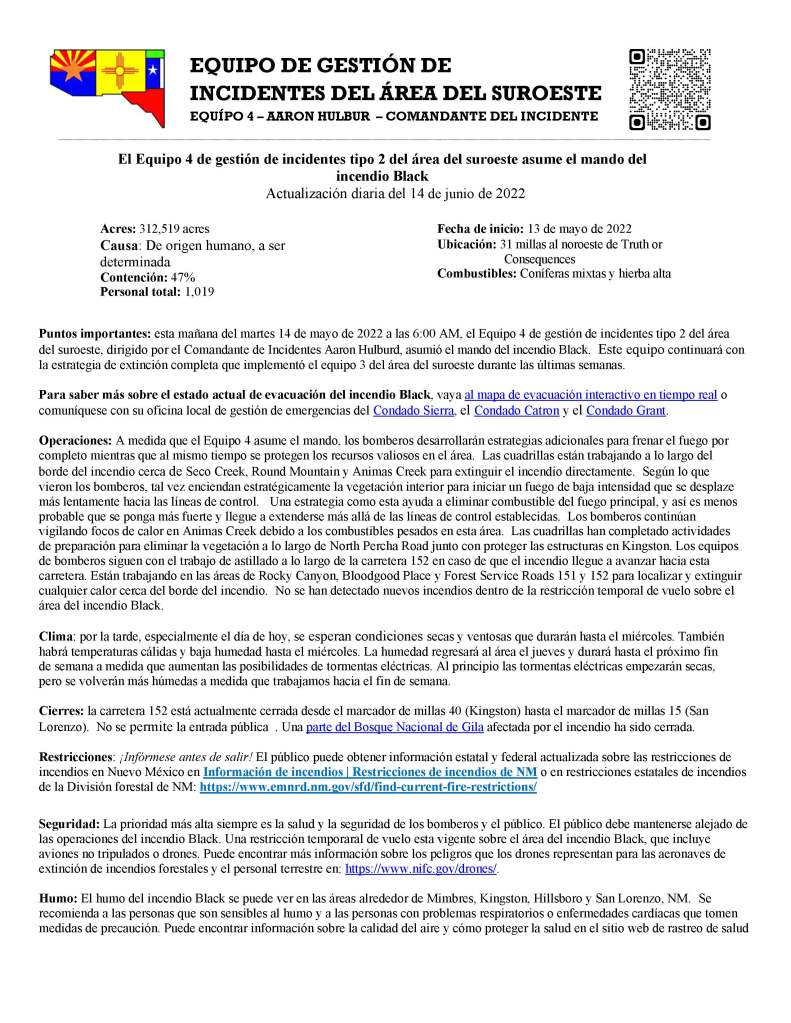 Highlights: The Southwest Area Type 2 Incident Management Team 4, led by Incident Commander Aaron Hulburd, assumed command of the Black Fire at 6:00 AM this morning, Tuesday, May 14, 2022. Southwest Team 4 will continue the full suppression strategy implemented by Southwest Team 3 over the previous weeks.