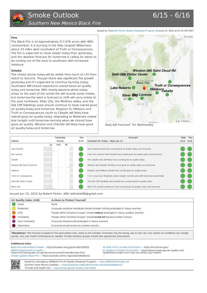 Smoke: Smoke from the Black Fire may be visible in the surrounding areas of Mimbres, Kingston, Hillsboro, and San Lorenzo, NM. Smoke-sensitive individuals and people with respiratory problems or heart disease are encouraged to take precautionary measures. Information on air quality and protecting your health can be found at the New Mexico Department of Health Environmental Public Health Tracking website: nmtracking.org. An interactive smoke map at https://fire.airnow.gov/ allows you to zoom into your area to see the latest smoke conditions. For additional information, please view the Black Fire Smoke Report.