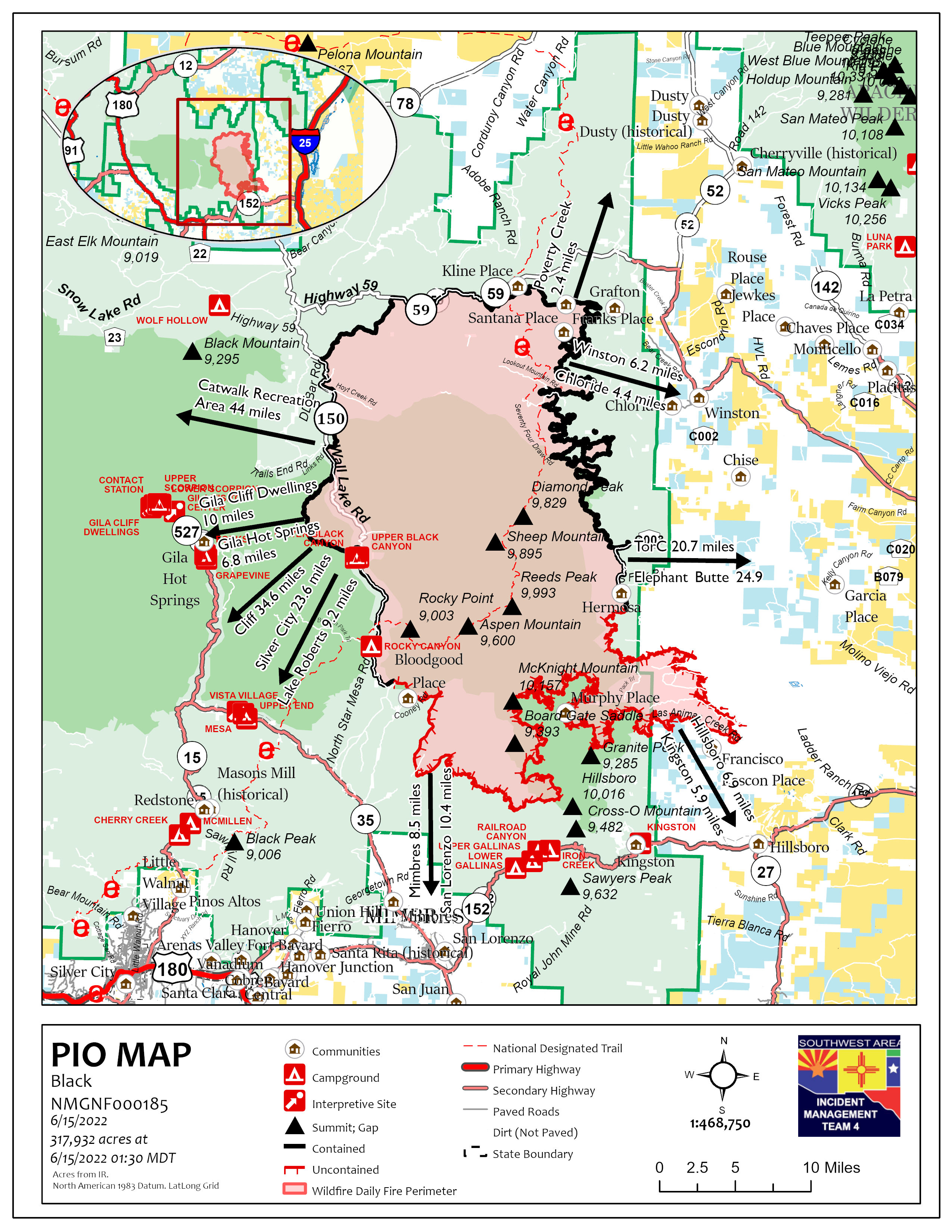 Closures: Highway 152 is currently closed from milepost 40 (Kingston) to milepost 15 (San Lorenzo). No public entry is allowed. A portion of the Gila National Forest affected by the fire has been closed.