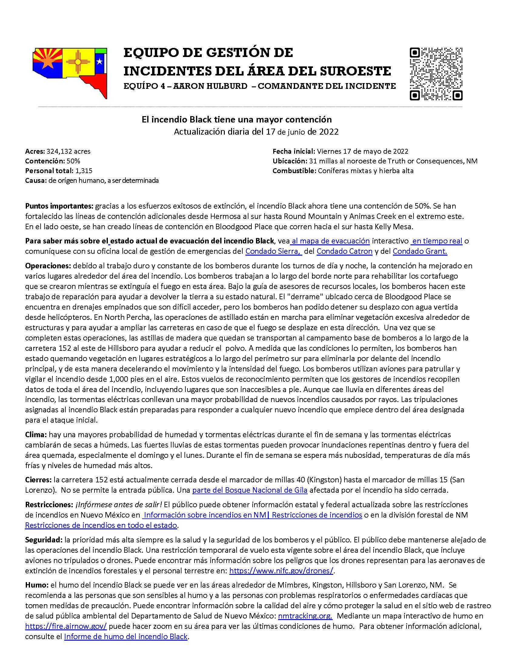 Humo: el humo del incendio Black se puede ver en las áreas alrededor de Mimbres, Kingston, Hillsboro y San Lorenzo, NM. Se recomienda a las personas que son sensibles al humo y a las personas con problemas respiratorios o enfermedades cardíacas que tomen medidas de precaución. Puede encontrar información sobre la calidad del aire y cómo proteger la salud en el sitio web de rastreo de salud pública ambiental del Departamento de Salud de Nuevo México: nmtracking.org. Mediante un mapa interactivo de humo en https://fire.airnow.gov/ puede hacer zoom en su área para ver las últimas condiciones de humo. Para obtener información adicional, consulte el Informe de humo del incendio Black.