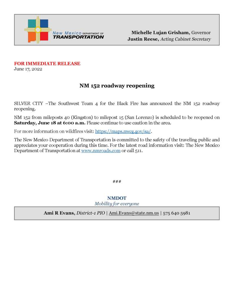 SILVER CITY –The Southwest Team 4 for the Black Fire has announced the NM 152 roadway reopening.
