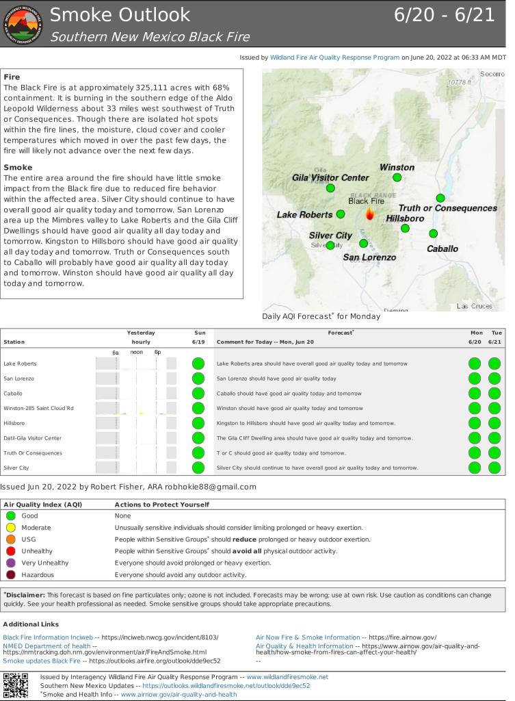 Smoke: Smoke has become less visible as rainstorms have moved into the Black Fire area. An interactive smoke map at https://fire.airnow.gov/ allows you to zoom into your area to see the latest smoke conditions. For additional information, please view the Black Fire Smoke Report.