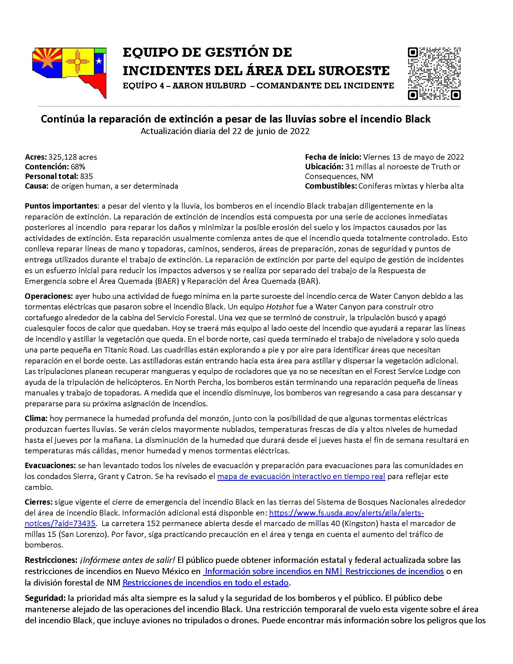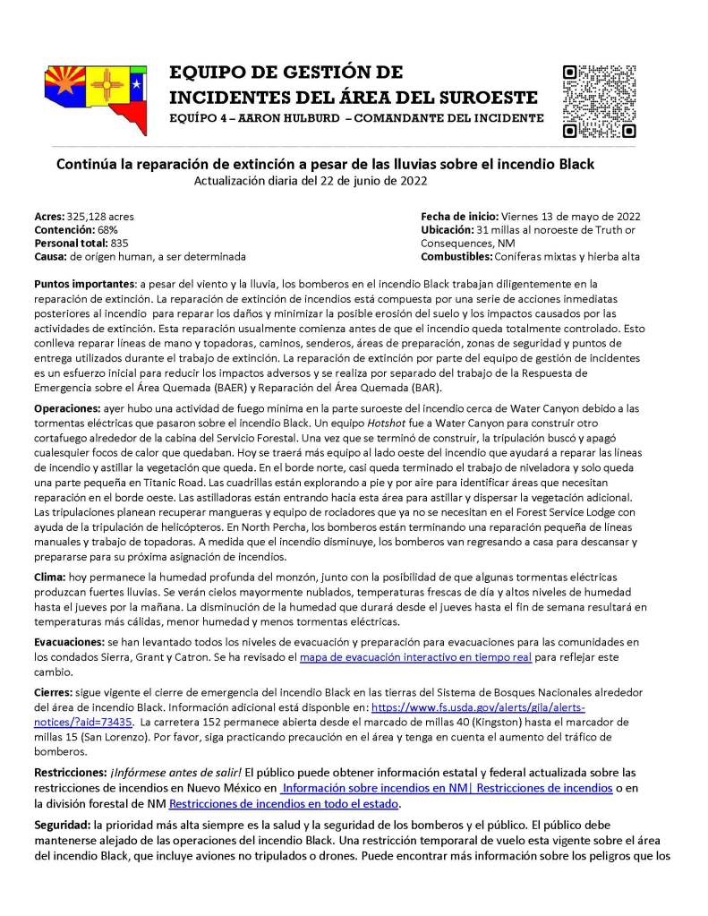 Cierres: sigue vigente el cierre de emergencia del incendio Black en las tierras del Sistema de Bosques Nacionales alrededor del área de incendio Black. Información adicional está disponble en: https://www.fs.usda.gov/alerts/gila/alerts-notices/?aid=73435. La carretera 152 permanece abierta desde el marcado de millas 40 (Kingston) hasta el marcador de millas 15 (San Lorenzo). Por favor, siga practicando precaución en el área y tenga en cuenta el aumento del tráfico de bomberos.