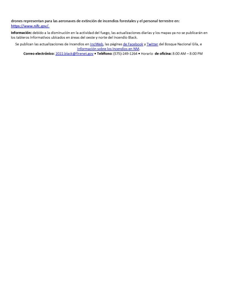 Seguridad: la prioridad más alta siempre es la salud y la seguridad de los bomberos y el público. El público debe mantenerse alejado de las operaciones del incendio Black. Una restricción temporaral de vuelo esta vigente sobre el área del incendio Black, que incluye aviones no tripulados o drones. Puede encontrar más información sobre los peligros que los drones representan para las aeronaves de extinción de incendios forestales y el personal terrestre en: https://www.nifc.gov/.