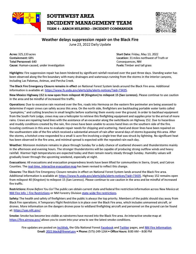 Closures: The Black Fire Emergency Closure remains in effecton National Forest System lands around the Black Fire area. Additional information is available at: https://www.fs.usda.gov/alerts/gila/alerts-notices/?aid=73435. Highway 152 remains open from milepost 40 (Kingston) to milepost 15 (San Lorenzo). Please continue to use caution in the area and be mindful of increased fire traffic.