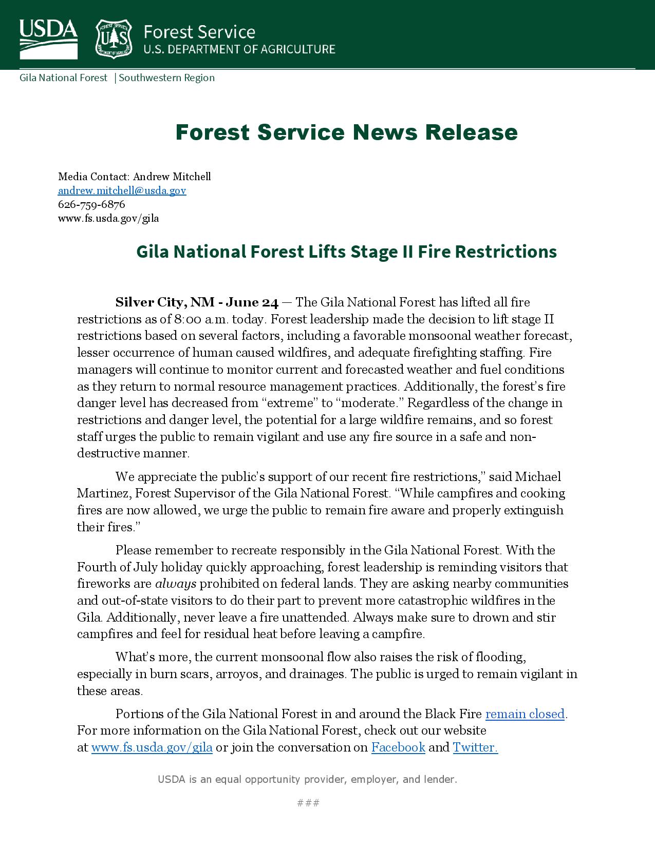 Restrictions: The Gila National Forest has lifted all fire restrictions as of 8:00 AM today. The decision to lift Stage II restrictions was based on several factors, including a favorable monsoonal weather forecast, lesser occurrence of human caused wildfires, and adequate firefighting staffing. The public can obtain current state and federal fire restriction information across New Mexico at NM Fire Info | Fire Restrictions or NM Forestry Division state-wide fire restrictions.