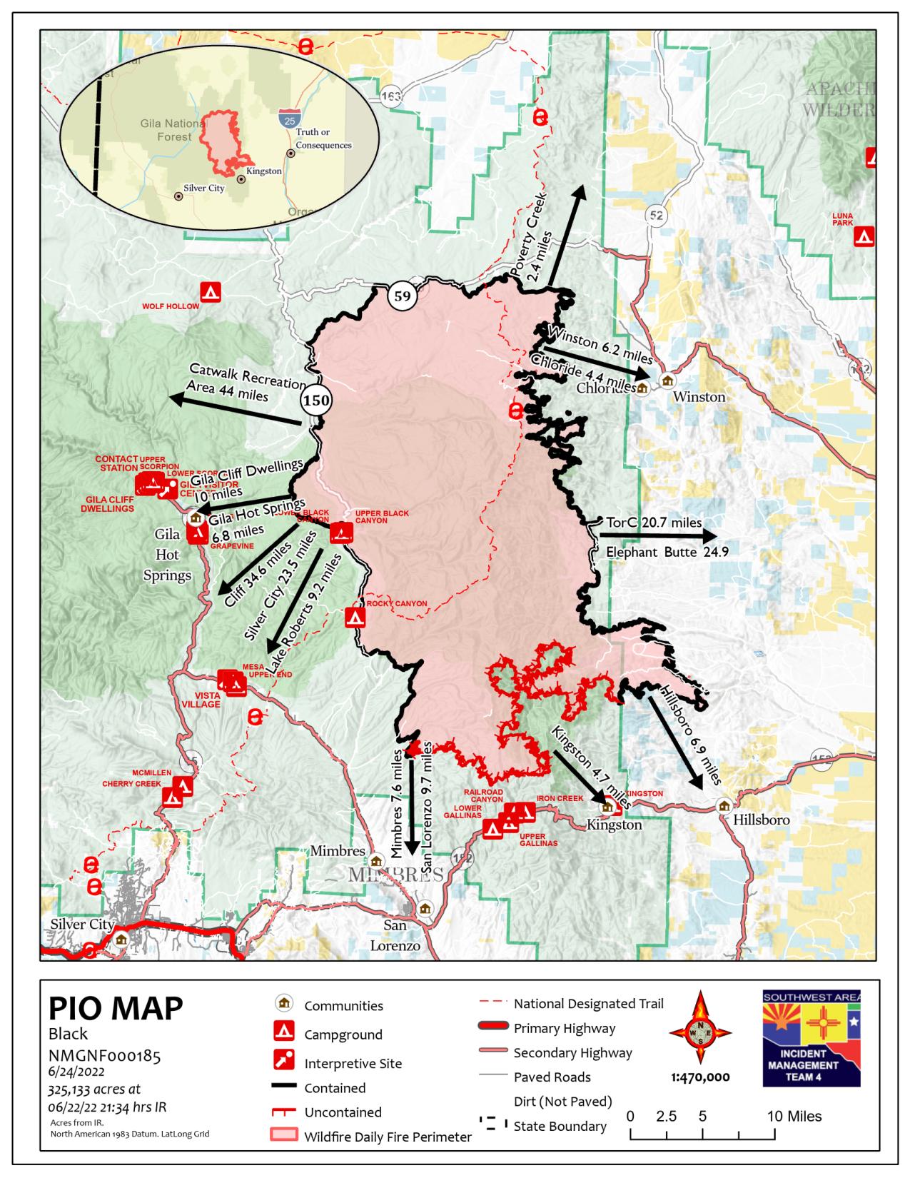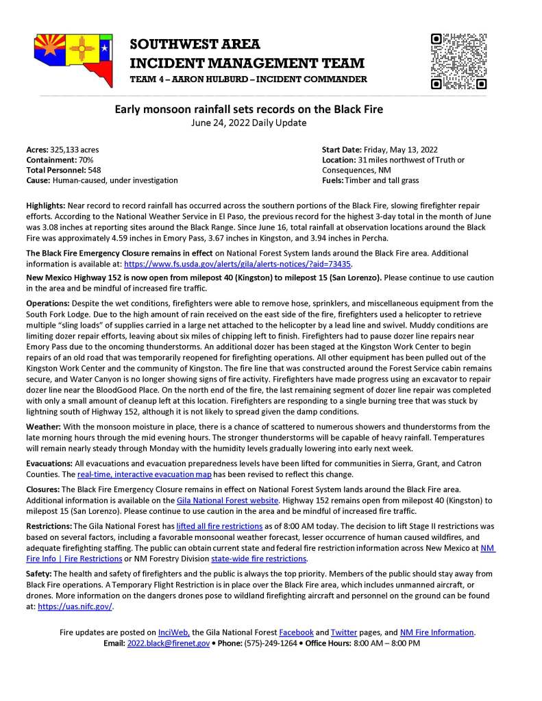 Closures: The Black Fire Emergency Closure remains in effecton National Forest System lands around the Black Fire area. Additional information is available on the Gila National Forest website. Highway 152 remains open from milepost 40 (Kingston) to milepost 15 (San Lorenzo). Please continue to use caution in the area and be mindful of increased fire traffic.