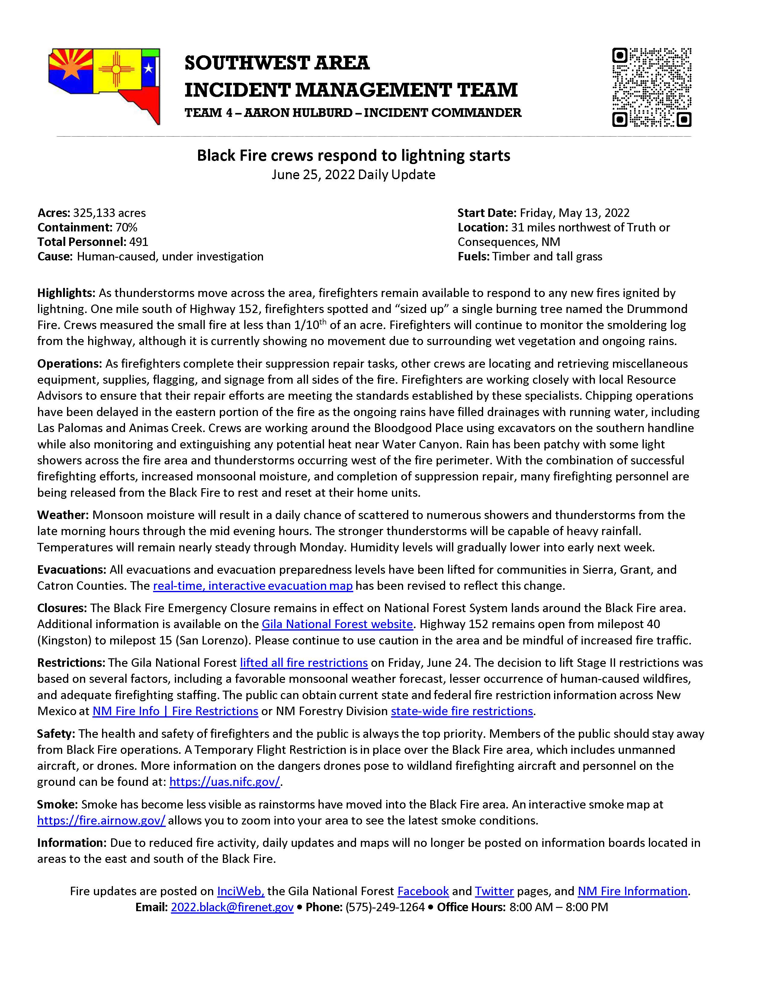 Safety: The health and safety of firefighters and the public is always the top priority. Members of the public should stay away from Black Fire operations. A Temporary Flight Restriction is in place over the Black Fire area, which includes unmanned aircraft, or drones. More information on the dangers drones pose to wildland firefighting aircraft and personnel on the ground can be found at: https://uas.nifc.gov/.