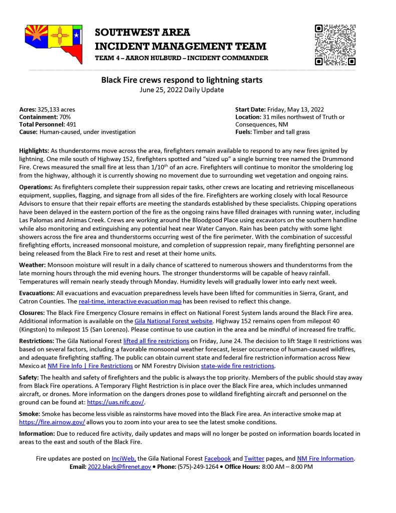 Evacuations: All evacuations and evacuation preparedness levels have been lifted for communities in Sierra, Grant, and Catron Counties. The real-time, interactive evacuation map has been revised to reflect this change.