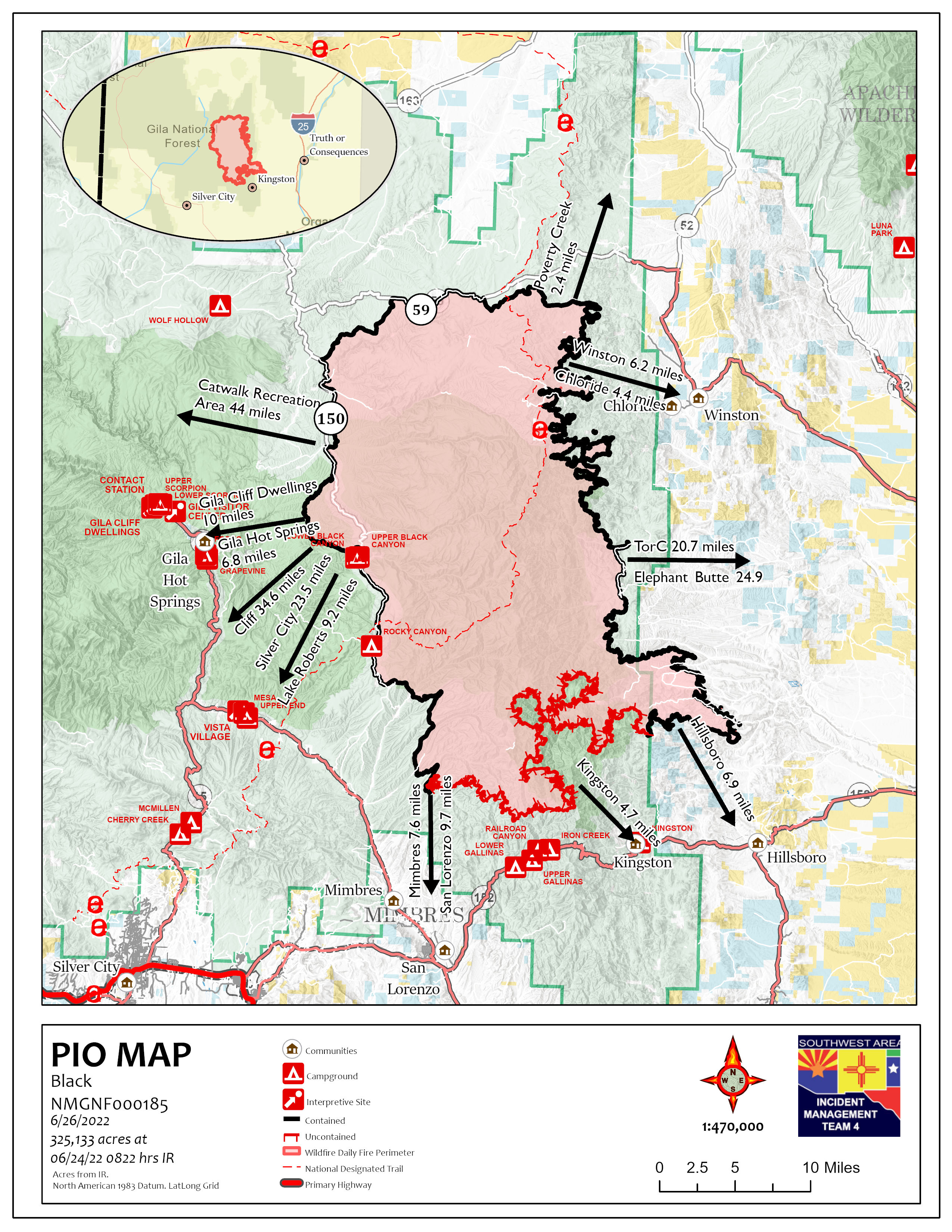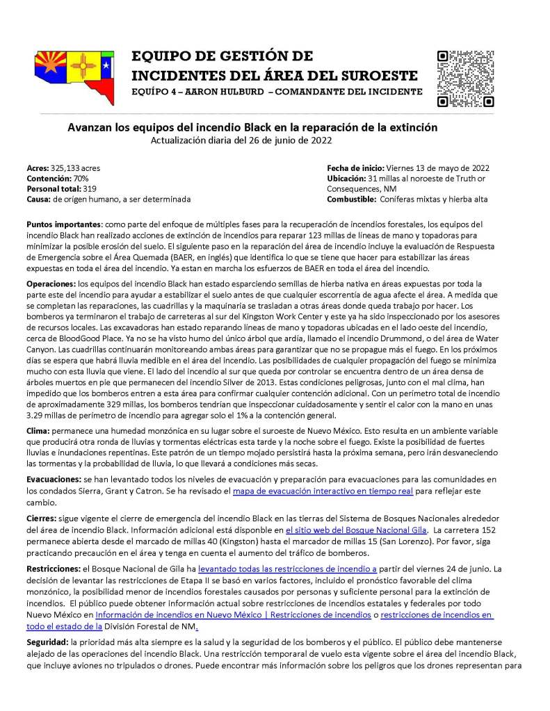 Cierres: sigue vigente el cierre de emergencia del incendio Black en las tierras del Sistema de Bosques Nacionales alrededor del área de incendio Black. Información adicional está disponble en el sitio web del Bosque Nacional Gila. La carretera 152 permanece abierta desde el marcado de millas 40 (Kingston) hasta el marcador de millas 15 (San Lorenzo). Por favor, siga practicando precaución en el área y tenga en cuenta el aumento del tráfico de bomberos.