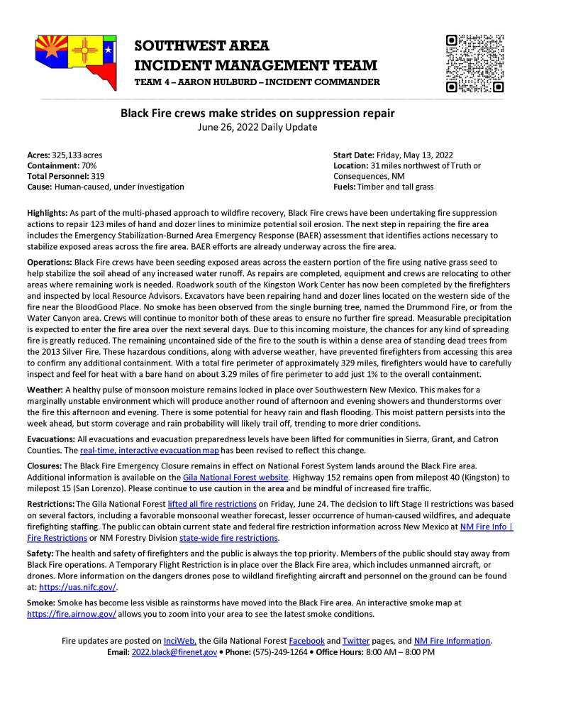 Closures: The Black Fire Emergency Closure remains in effecton National Forest System lands around the Black Fire area. Additional information is available on the Gila National Forest website. Highway 152 remains open from milepost 40 (Kingston) to milepost 15 (San Lorenzo). Please continue to use caution in the area and be mindful of increased fire traffic.