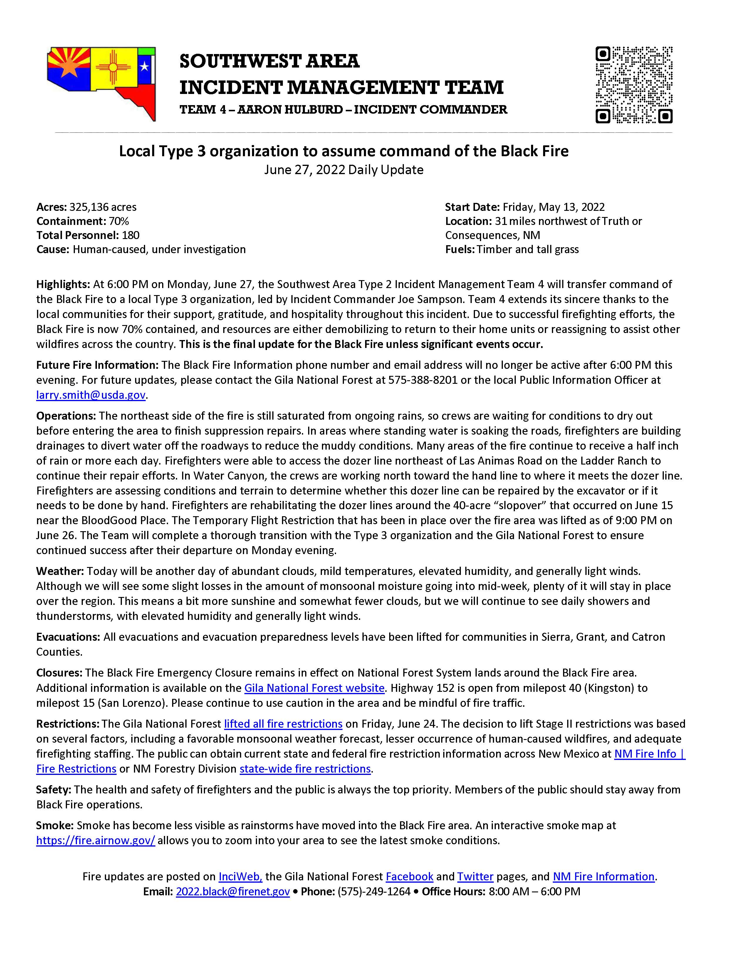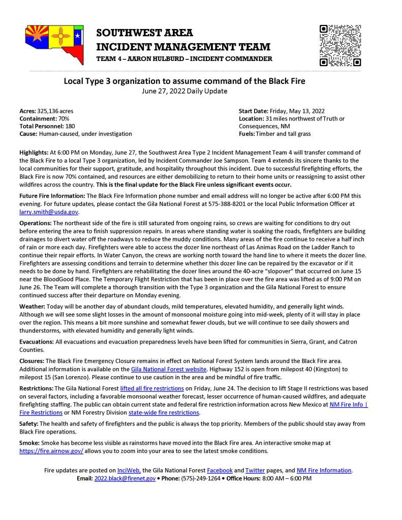Highlights: At 6:00 PM on Monday, June 27, the Southwest Area Type 2 Incident Management Team 4 will transfer command of the Black Fire to a local Type 3 organization, led by Incident Commander Joe Sampson. Team 4 extends its sincere thanks to the local communities for their support, gratitude, and hospitality throughout this incident. Due to successful firefighting efforts, the Black Fire is now 70% contained, and resources are either demobilizing to return to their home units or reassigning to assist other wildfires across the country. This is the final update for the Black Fire unless significant events occur.