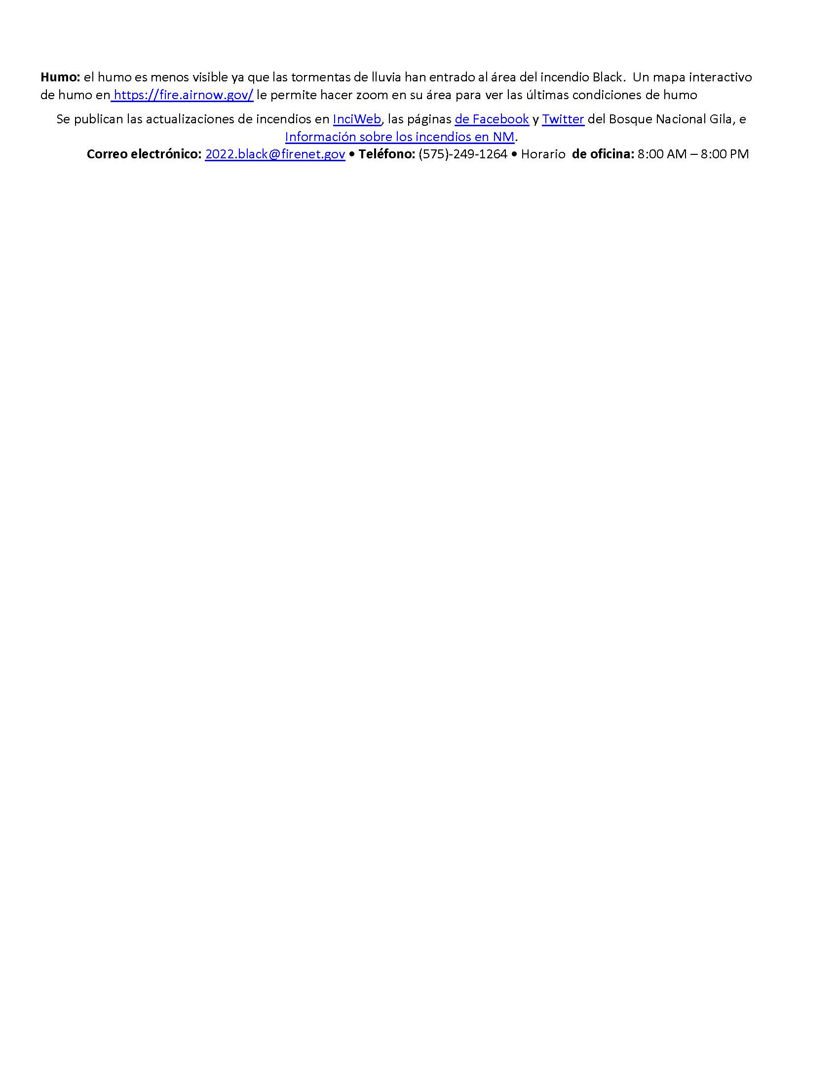 Información futura sobre incendios: El número de teléfono y la dirección de correo electrónico del incendio Black ya no estarán activos después de las 6:00 PM esta tarde. Para futuras actualizaciones, comuníquese con el Bosque Nacional de Gila al 575-388-8201 o con el Oficial de Información Pública local en larry.smith@usda.gov.