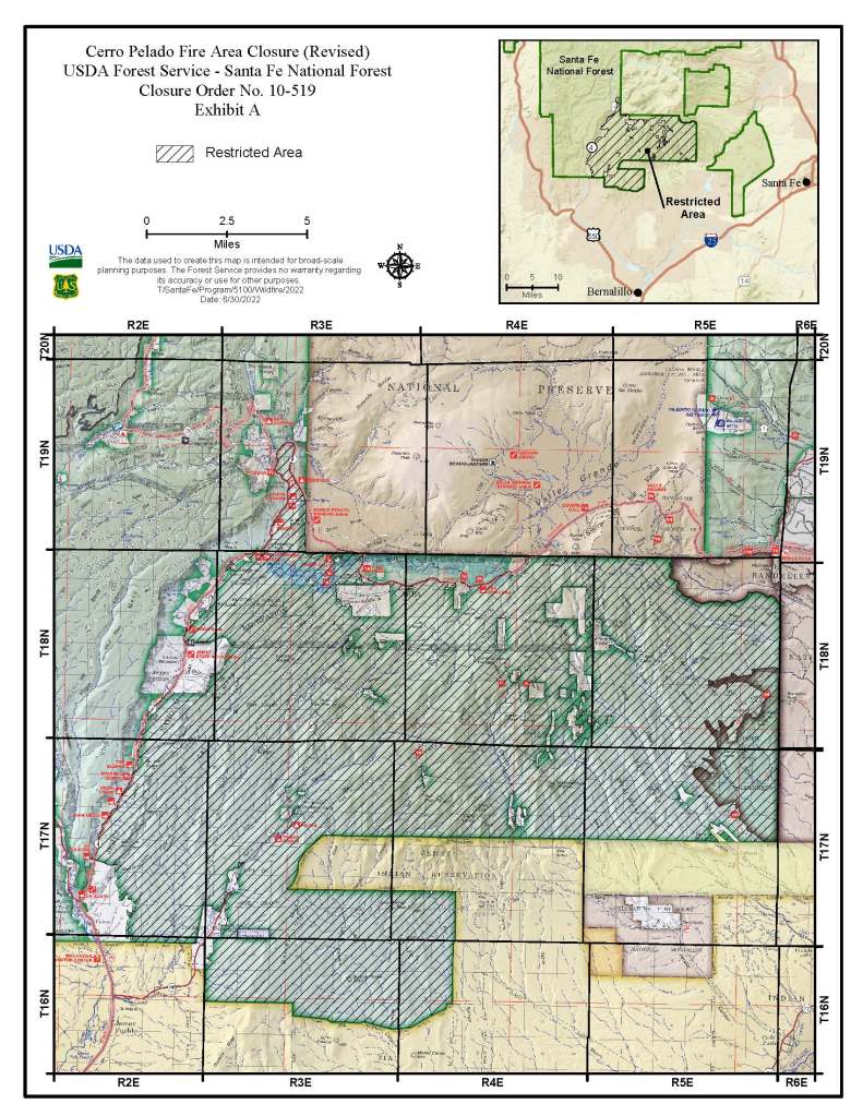 SANTA FE, NM – July 1, 2022 – The Santa Fe National Forest (SFNF) today issued an additional closure order to protect public health and safety in the event of potential post-fire impacts from the Cerro Pelado Fire, including debris flow and flash flooding. Closure Order No. 10-519 joins the earlier Order No. 10-515, and both will remain in effect until rescinded or until Dec. 31, 2022, whichever comes earlier.