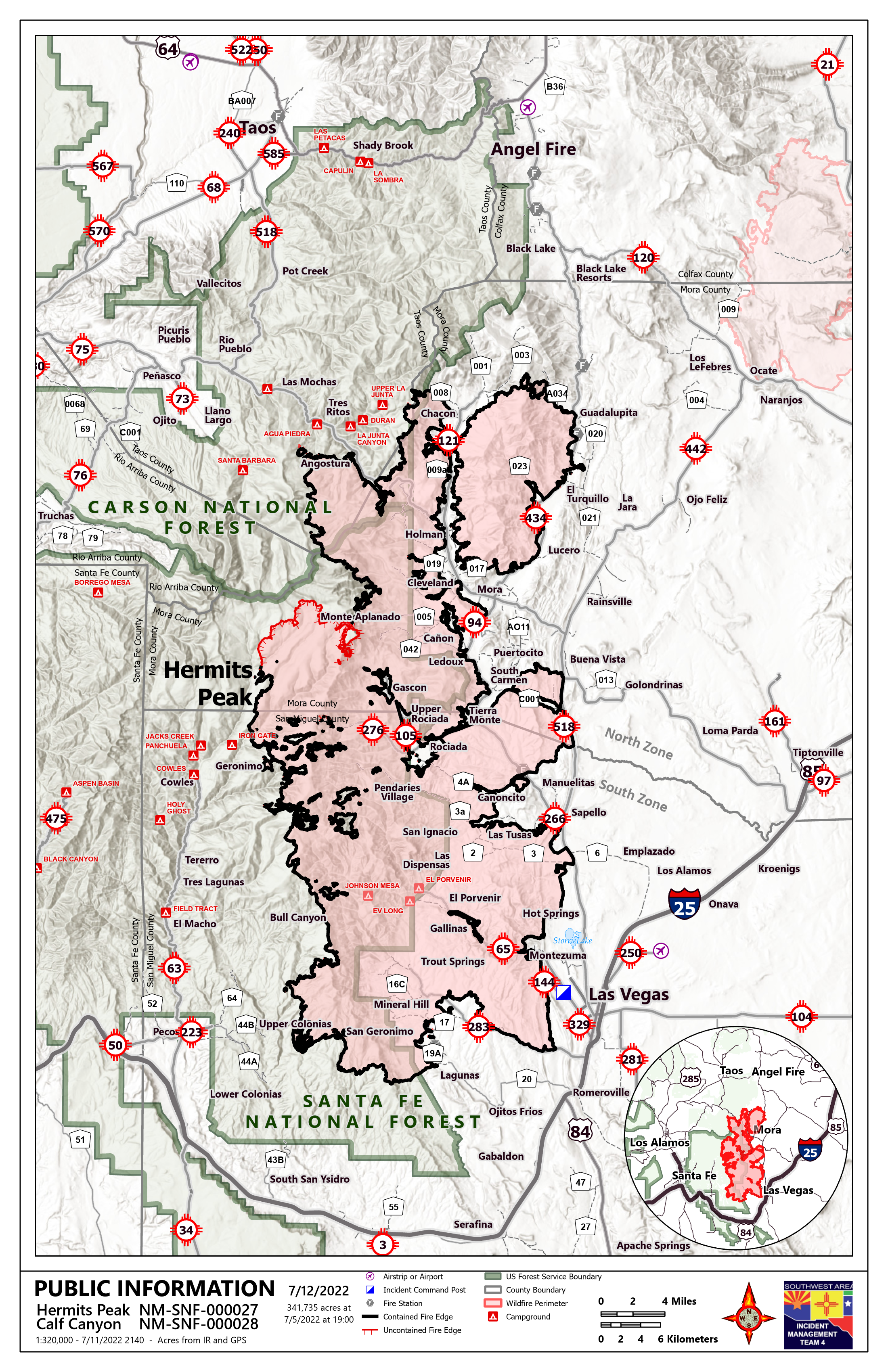 Highlights: The Southwest Area Type 2 Incident Management Team 4, led by Incident Commander Aaron Hulburd, assumed command of the Hermits Peak and Calf Canyon Fires at 7:00 AM on Monday, July 11, 2022. Southwest Team 4 will continue the full suppression strategy implemented by Great Basin Incident Management Team 7, with an emphasis on suppression repair activities.