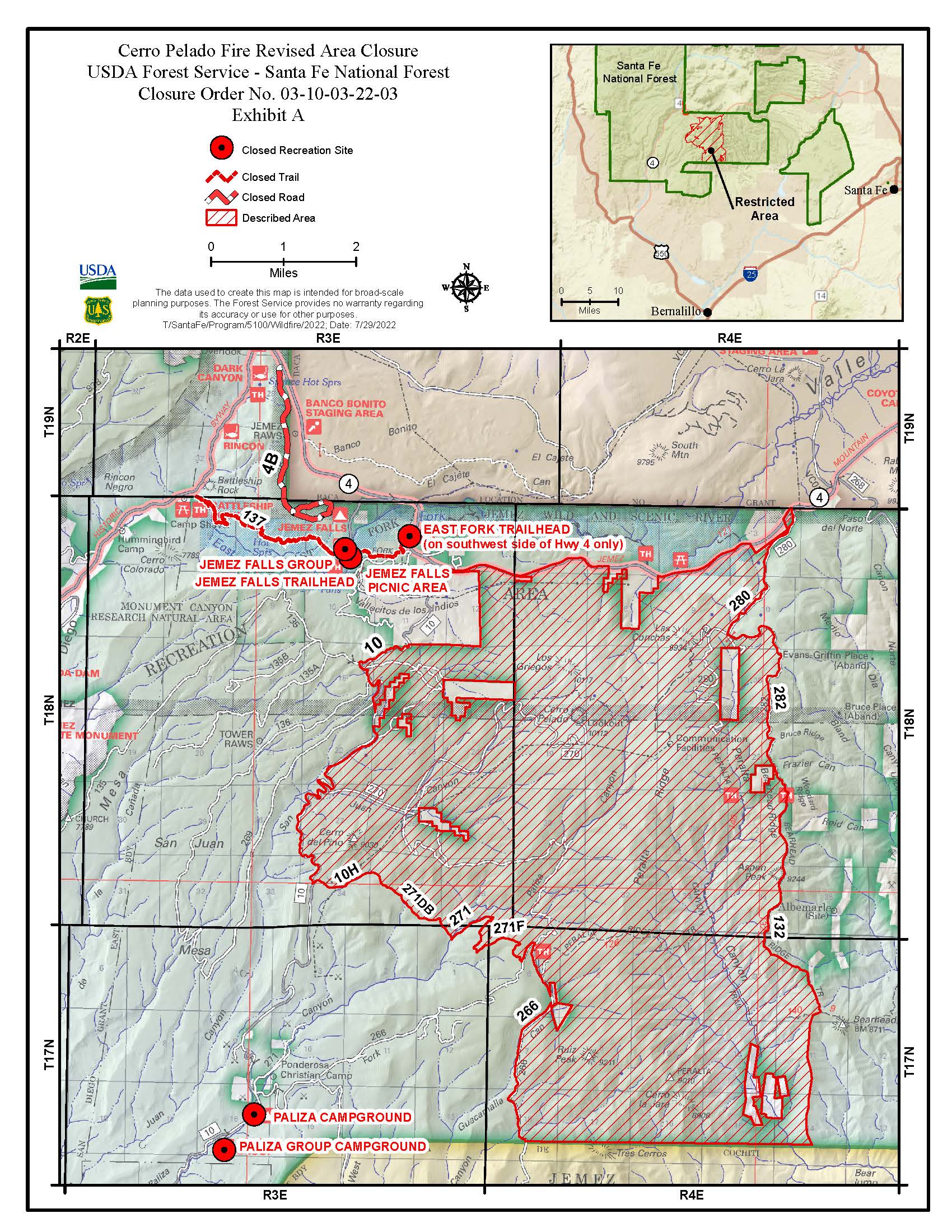 SANTA FE, NM – Aug. 2, 2022 – The Santa Fe National Forest (SFNF) today issued a revised closure order to protect public health and safety during wildfire suppression repair operations and in the event of potential post-fire impacts from the Cerro Pelado Fire, including debris flow and flash flooding. The new closure order will remain in effect until rescinded or until Dec. 31, 2022, whichever comes earlier.