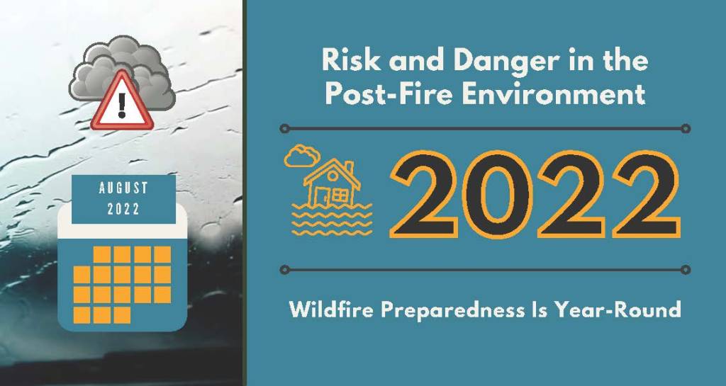 SANTA FE, NM – August 4, 2022 – Therecent devastating wildfires and subsequent flash flooding are fresh in the minds of many New Mexicans – it can feel debilitating to grieve the loss of lives and property while the risk of danger remains. There are a number of services available and actions that can be taken to help protect families and property in fire-affected areas. In cooperation with our partners, the Santa Fe National Forest (SFNF) is sharing the “Wildfire Preparedness is Year-Round” campaign message for August: Risk and Danger in the Post-Fire Environment.