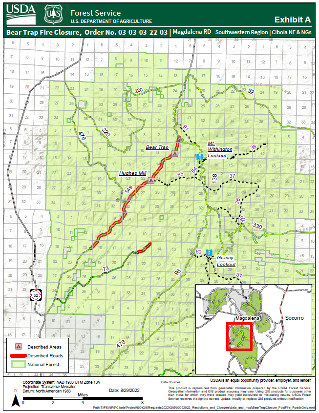 Albuquerque, NM, Aug 31, 2022 – An area and road closure (Order 03-03-03-22-03) has been issued for National Forest System lands as described below and as depicted on the attached map as Exhibit A, within the Magdalena Ranger District, Cibola National Forest, Socorro County, New Mexico. This Order is effective on September 1, 2022, at 12:00 a.m., and shall remain in effect until December 31, 2022, or until rescinded, whichever occurs first.