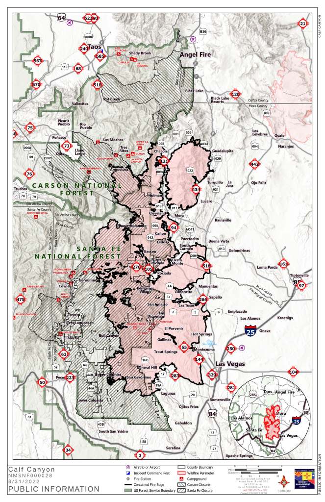 Closures: On August 9, the Santa Fe National Forest reduced the fire closure area, opening additional access to the Pecos Wilderness. To view the closure order and map, please visit Santa Fe – Alerts & Notices (usda.gov). Due to the progress of suppression repair, more areas in the Camino Real Ranger District on the Carson National Forest were reopened on August 24. To view the new closure order and map, please visit Carson National Forest – Alerts & Notices (usda.gov). More areas will reopen over time as suppression repair is completed and areas become safe to reenter. Areas directly burned by the fire or at continued risk from flash flooding may stay closed longer for firefighter and public safety. Short-term closures in reopened areas may still occur from time to time. As hunting season begins, details and maps for newly reopened areas will continue to be updated on the Santa Fe and Carson Forest Alerts & Notices webpages and forest social media.