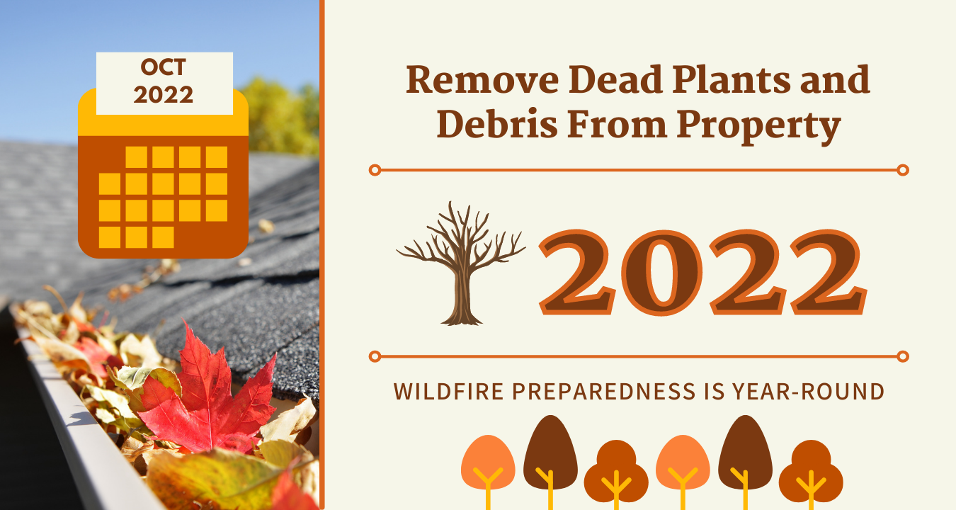 - Plan months ahead and circle the first Saturday of May on your calendar as the target date to clean up and remove debris and dead plants around your home. The National Fire Protection Association’s Wildfire Community Preparedness Day for 2023 is May 6.
