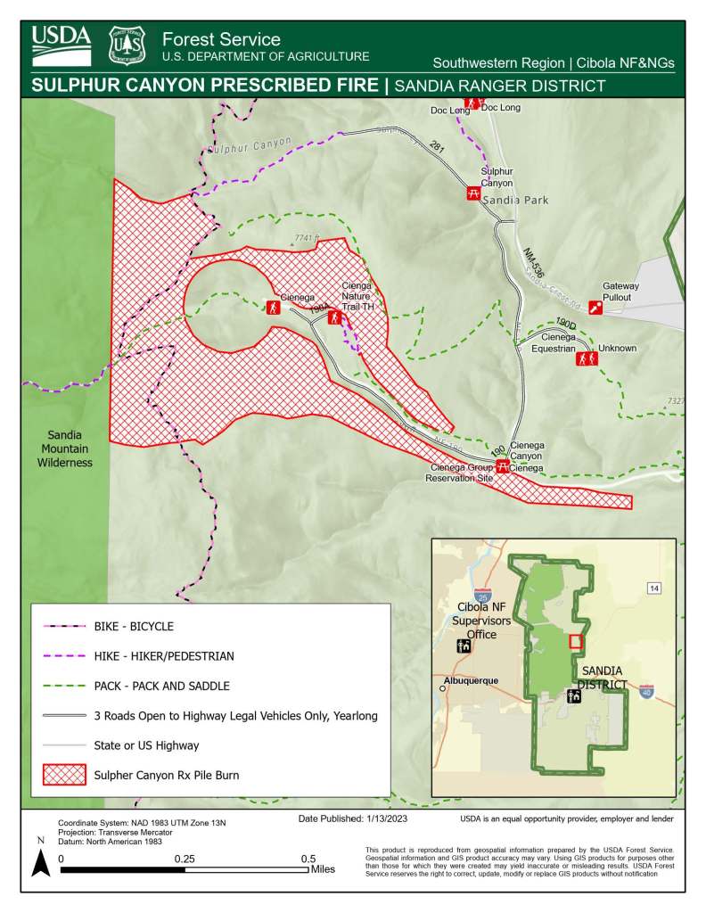 ALBUQUERQUE, NM – January 24, 2023 – Cibola National Forest and National Grasslands fire crews are preparing this month to strategically implement 100 acres of piles within the Sulphur unit under the Sandia Piles Rx plan. The pile burn area is located in the Sandia east mountains, north of I-40, west of NM-14 and south of NM-536. See map attached. Smoke may be visible from Albuquerque, Tijeras and Edgewood.