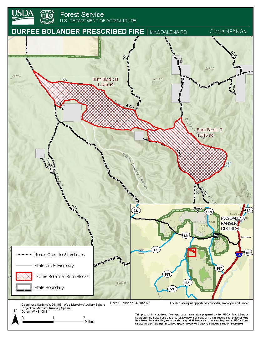 Magdalena Ranger District: Durfee Bolander RX Fire: 2,151 acres on Unit 7 & 8 in the vicinity of Durfee and Bolander Canyon along FSR 476, FSR 220, 661A and 220X. Smoke may be visible from the communities of Magdalena, Alamo and Datil. See Map