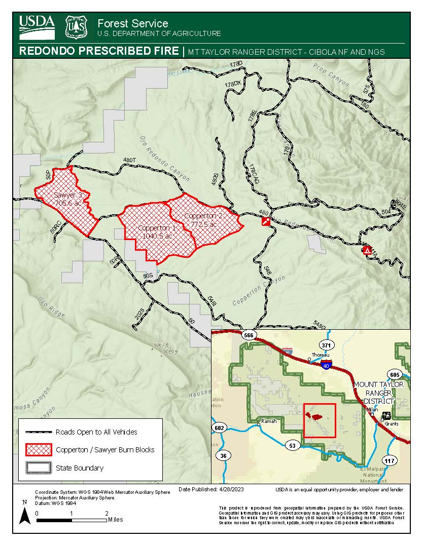 Mount Taylor Ranger District: Redondo RX Fire – Copperton/Sawyer Blocks: 1,812 acres on the Copperton and 705 acres on the Sawyer units located 3 miles west of Post Office Flats on Forest Road (FR) 480 in the Zuni Mountains. Smoke may be visible in the surrounding area of Ramah, Gallup, Thoreau, Bluewater, Grants and Millan. See Map.