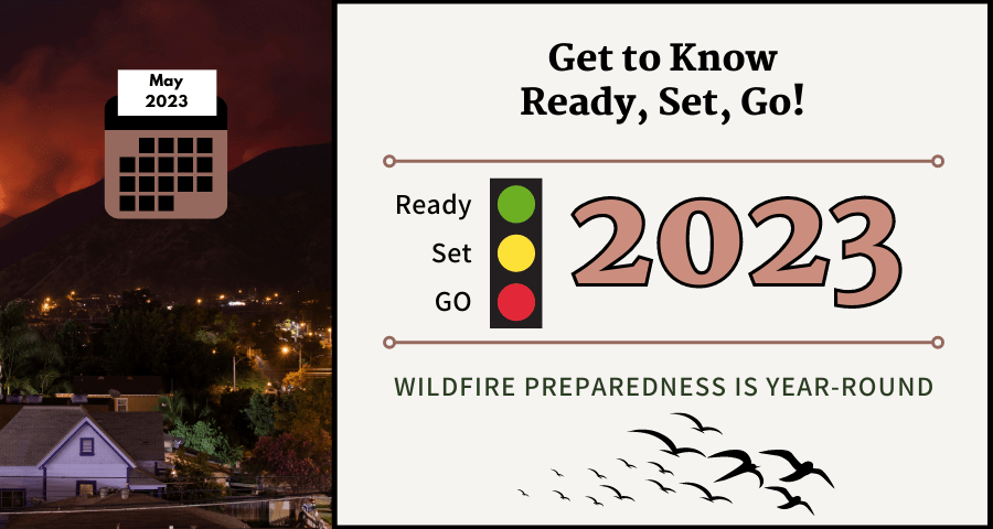 With the start of the 2023 wildfire season in New Mexico and Wildfire Community Preparedness Day on Saturday May 6th, it is vital to have an emergency kit and an evacuation plan in place for you and your family. The 2023 Wildfire Preparedness is Year-Round campaign that provides monthly wildfire preparedness tasks that follow the changing seasons. The May message from NM wildland fire partners, agencies and non-governmental organizations is, “Get to know Ready, Set, Go!.”
