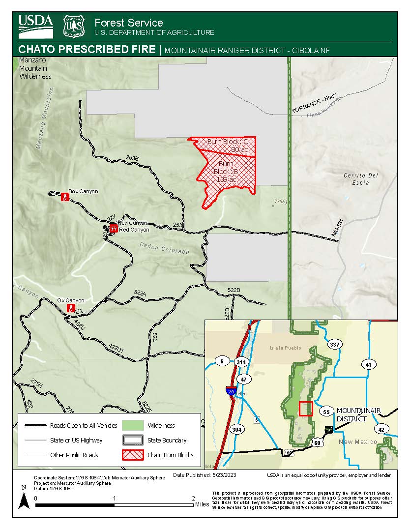 MOUNTAINAIR, NM – June 1, 2023 – Fire Managers on the Cibola National Forest & National Grasslands (NF & NGs) plan to continue the prescribed fire operations that began Sunday, May 28th. Ignitions are planned to continue as early as Friday, June 2. Predicted favorable weather conditions have opened a burn window on Friday to complete the remaining 80 acres of this project and meet prescribed fire objectives.