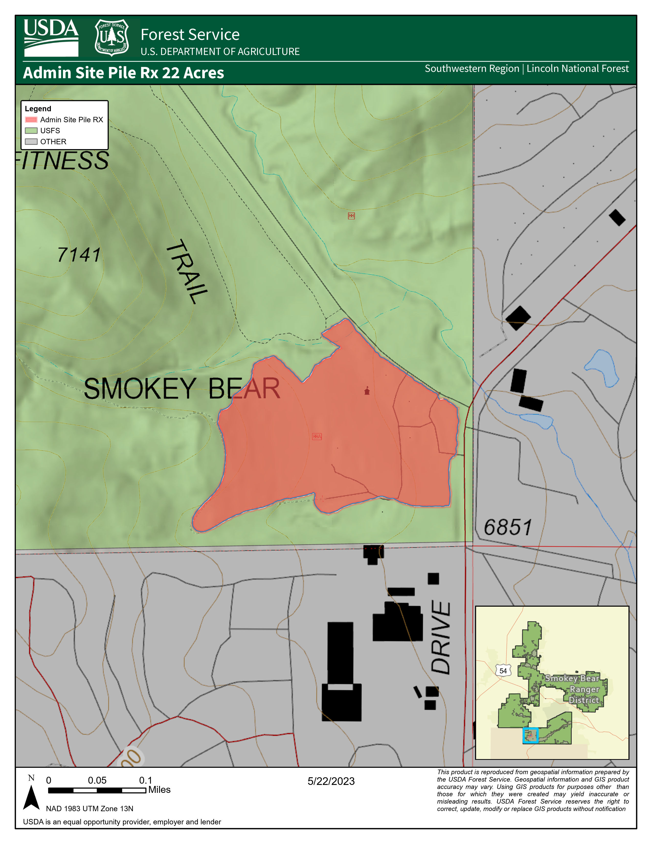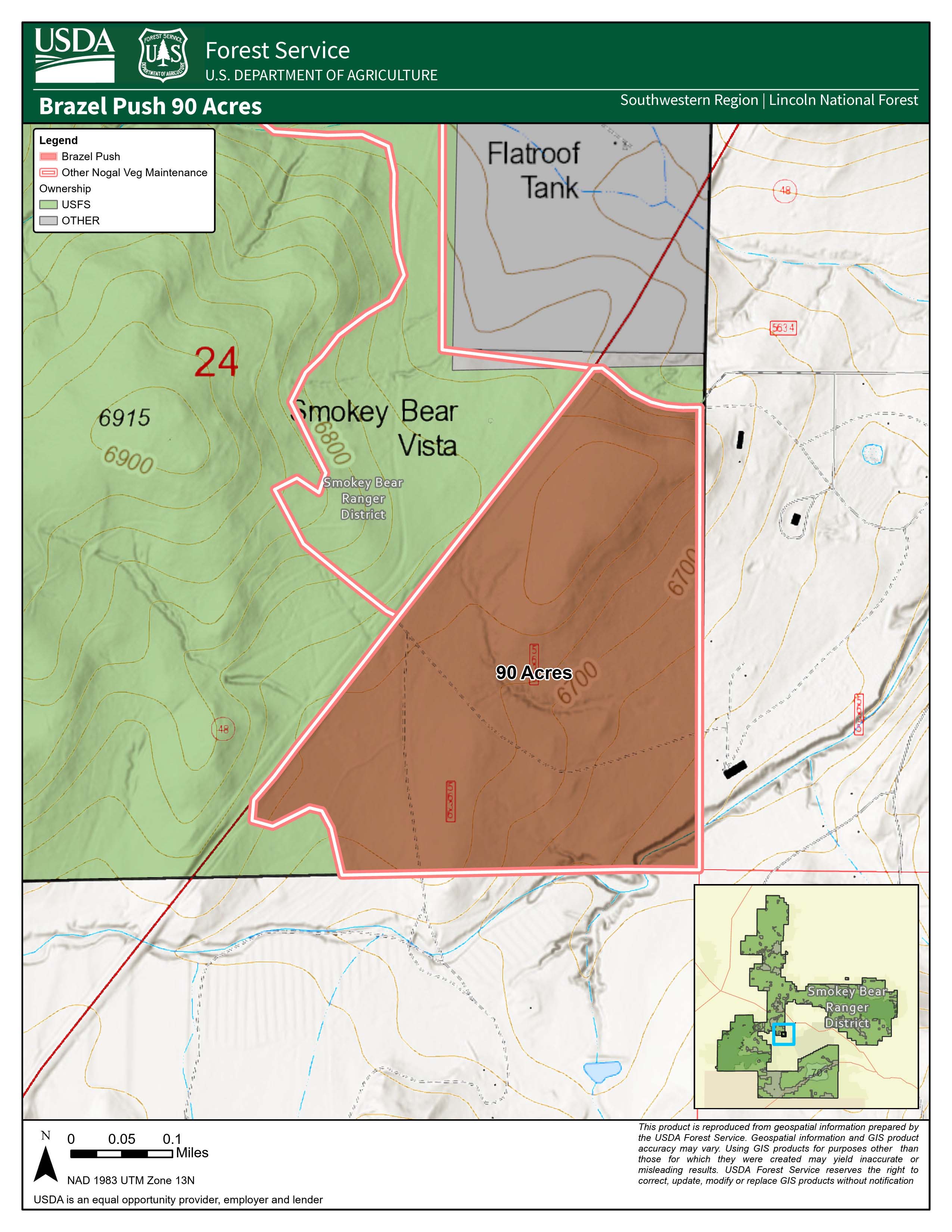 Brazel Push is an approximately 90-acre area located between Capitan and Ruidoso. The Smokey Bear Administration site is an approximately 22-acre area located near the administrative site in Ruidoso, and Jack’s Peak is a 250-acre area east of Ancho.