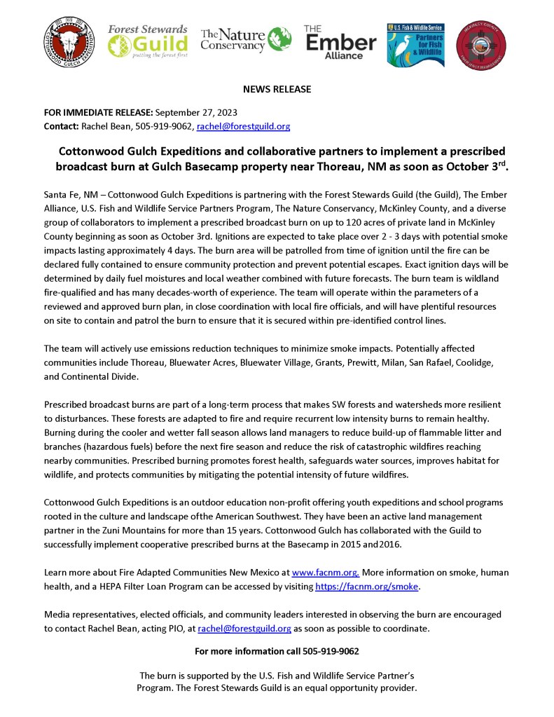 Santa Fe – Cottonwood Gulch Expeditions is partnering with the Forest Stewards Guild (the Guild), The Ember Alliance, U.S. Fish and Wildlife Service Partners Program, The Nature Conservancy, McKinley County, and a diverse group of collaborators to implement a prescribed broadcast burn on up to 120 acres of private land in McKinley County beginning as soon as October 3rd. Ignitions are expected to take place over 2 – 3 days with potential smoke impacts lasting approximately 4 days. The burn area will be patrolled from time of ignition until the fire can be declared fully contained to ensure community protection and prevent potential escapes. Exact ignition days will be determined by daily fuel moistures and local weather combined with future forecasts. The burn team is wildland fire-qualified and has many decades-worth of experience. The team will operate within the parameters of a reviewed and approved burn plan, in close coordination with local fire officials, and will have plentiful resources on site to contain and patrol the burn to ensure that it is secured within pre-identified control lines.