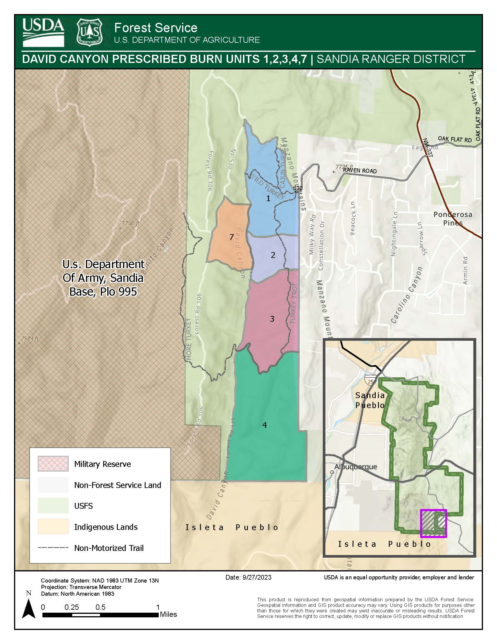 ALBUQUERQUE, NM – Oct. 11, 2023 – Pending favorable conditions, fire managers on the Cibola National Forest & National Grasslands (NF & NGs) may implement the previously announced David Canyon prescribed fire (RX) on the Sandia Ranger District as early as Tuesday October 17, 2023. Smoke may be visible in the surrounding areas of Tijeras, Edgewood, Moriarty and Albuquerque.