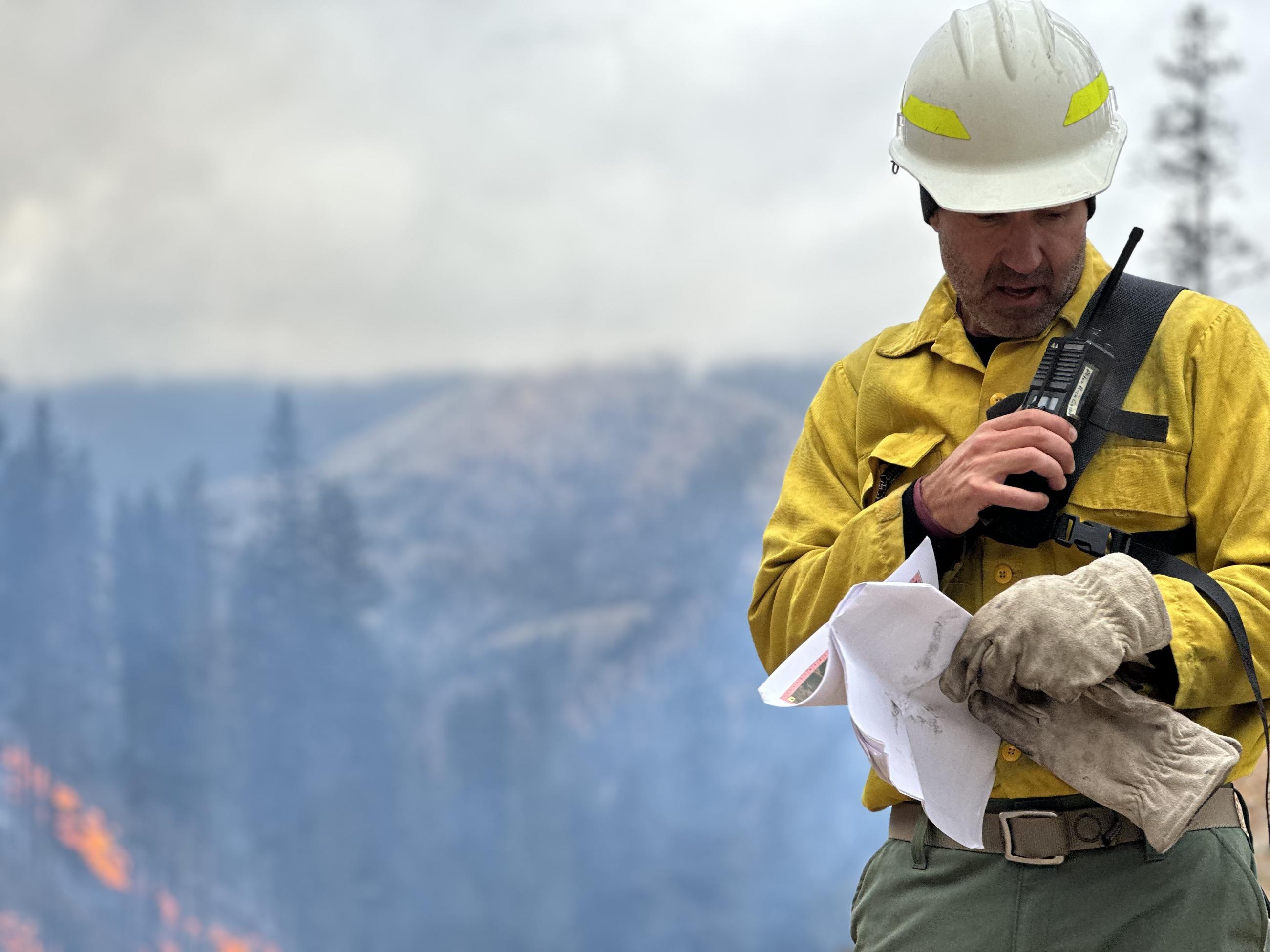 (Photo: A fire crew member coordinates with a colleague over the radio on Oct. 29, 2023)