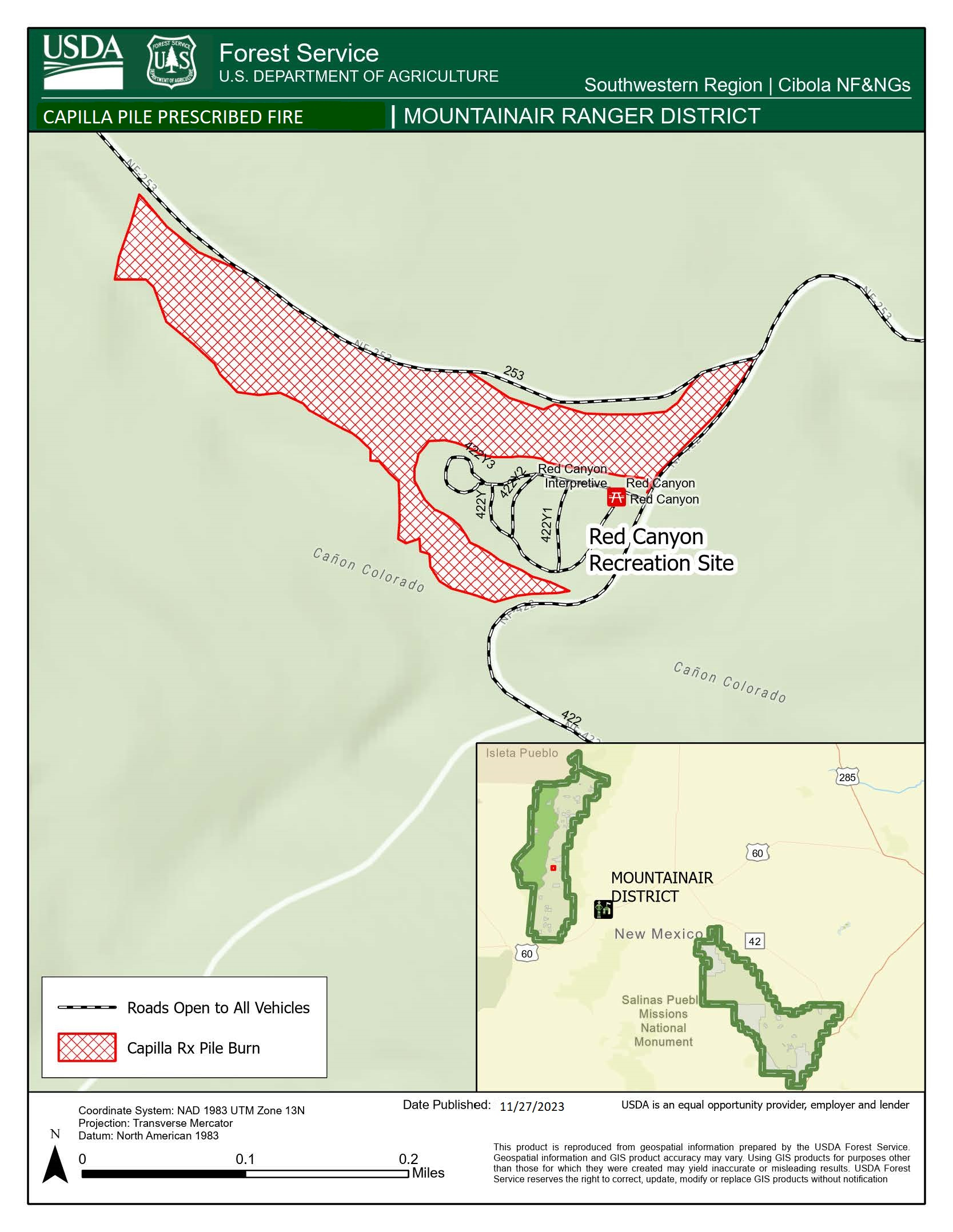 ALBUQUERQUE, NM – Nov. 29, 2023 – Today, per prescribed burn plan objectives, Cibola National Forest and National Grasslands fire crews completed ignition of 13 acres of pile burning within the Capilla Fuels Reduction and Restoration Project in the Manzano Mountains. Piles were located between Upper and Lower Red Canyon Campgrounds, just west of FSR 253/422. Map attached.