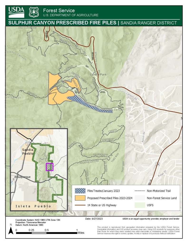 ALBUQUERQUE, NM – Jan. 30, 2024 – Cibola National Forest and National Grasslands fire crews are preparing to implement prescribed fire operations on approximately 10 acres of piles within the previously announced Sulphur unit of the Sandia Piles RX Plan on January 31. The pile burn area is located in the Sandia east mountains, north of I-40, west of NM-14 and south of NM-536. See map attached. Smoke may be visible from Albuquerque, Tijeras and Edgewood.