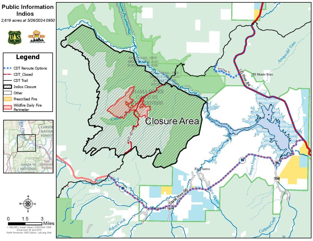 Closures: Closure Order 03-10-01-24-02 is in place and includes all National Forest System lands within the boundary of the Coyote Ranger District starting from the Continental Divide trail #298 at Highway 96 going north across Forest Road (FR) 77, through the Chama River Canyon Wilderness to Skull Bridge (Ojitos Trail head) on FR 151. FR 11 northwest to the Chama River Canyon Wilderness boundary and Junction with FR 8; FR 169 (from junction with FR 11) south to FR 473; FR 473 south to FR 64; FR 64 South to the junction of FR 77; and FR 77 east to the Chama River Canyon Wilderness boundary. FR 77 from the Forest boundary and County Road 418 to the junction of FR 64 and FR 77. The Chama River Canyon Wilderness south of Rio Gallina and south of Rio Chama. Visit Inciweb for the full order and map.