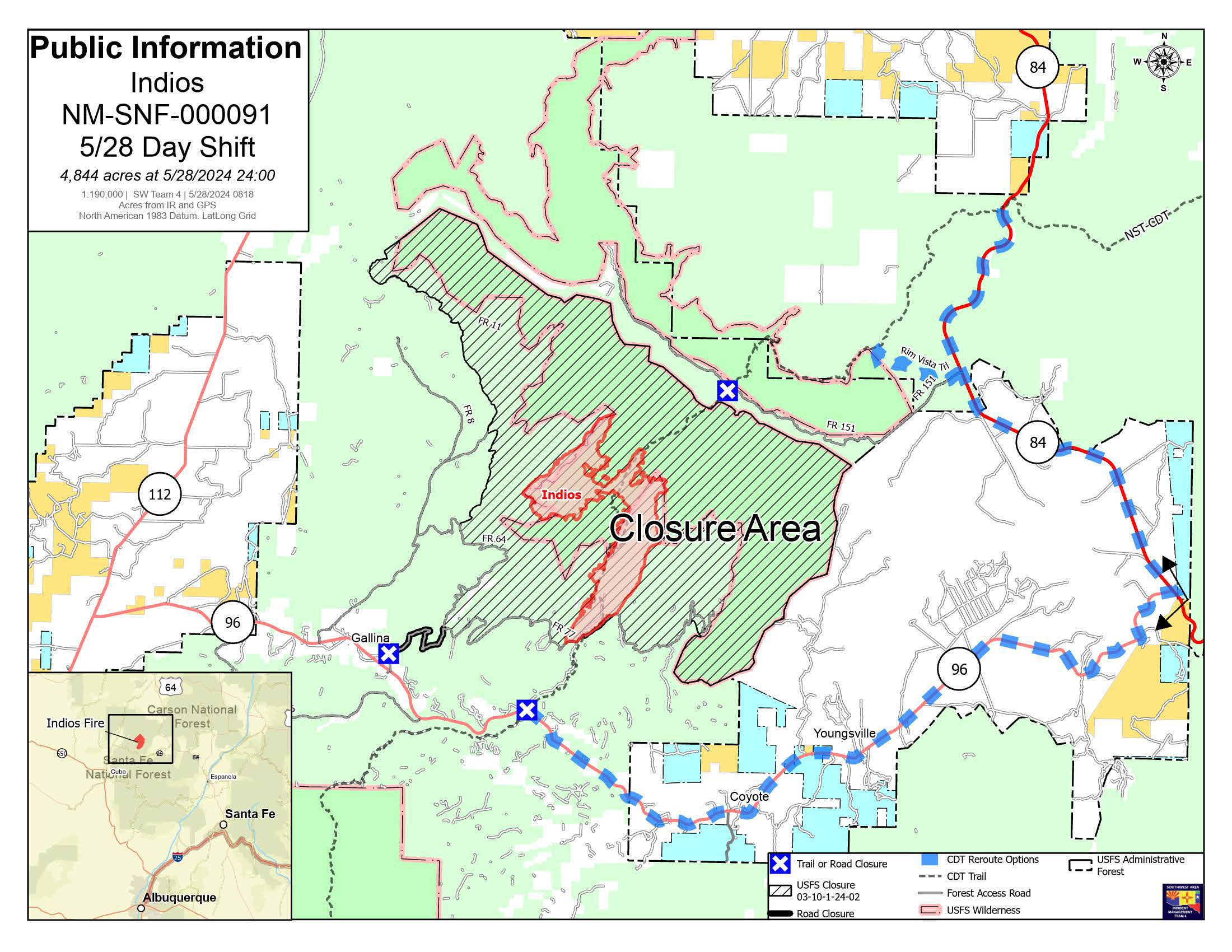 Closures: The Santa Fe National Forest has issued an emergency area closure for the Indios Fire. The purpose of the closure order is to protect public health and safety and the safety of all personnel working on the fire. The full closure order (No. 03-12-05-23-22) and map are available on Inciweb. Camping and water will be available at the Coyote Ranger Station for Continental Divide Trail hikers impacted by this closure.