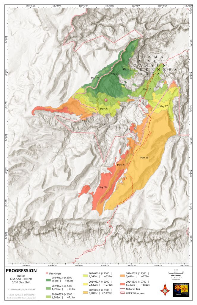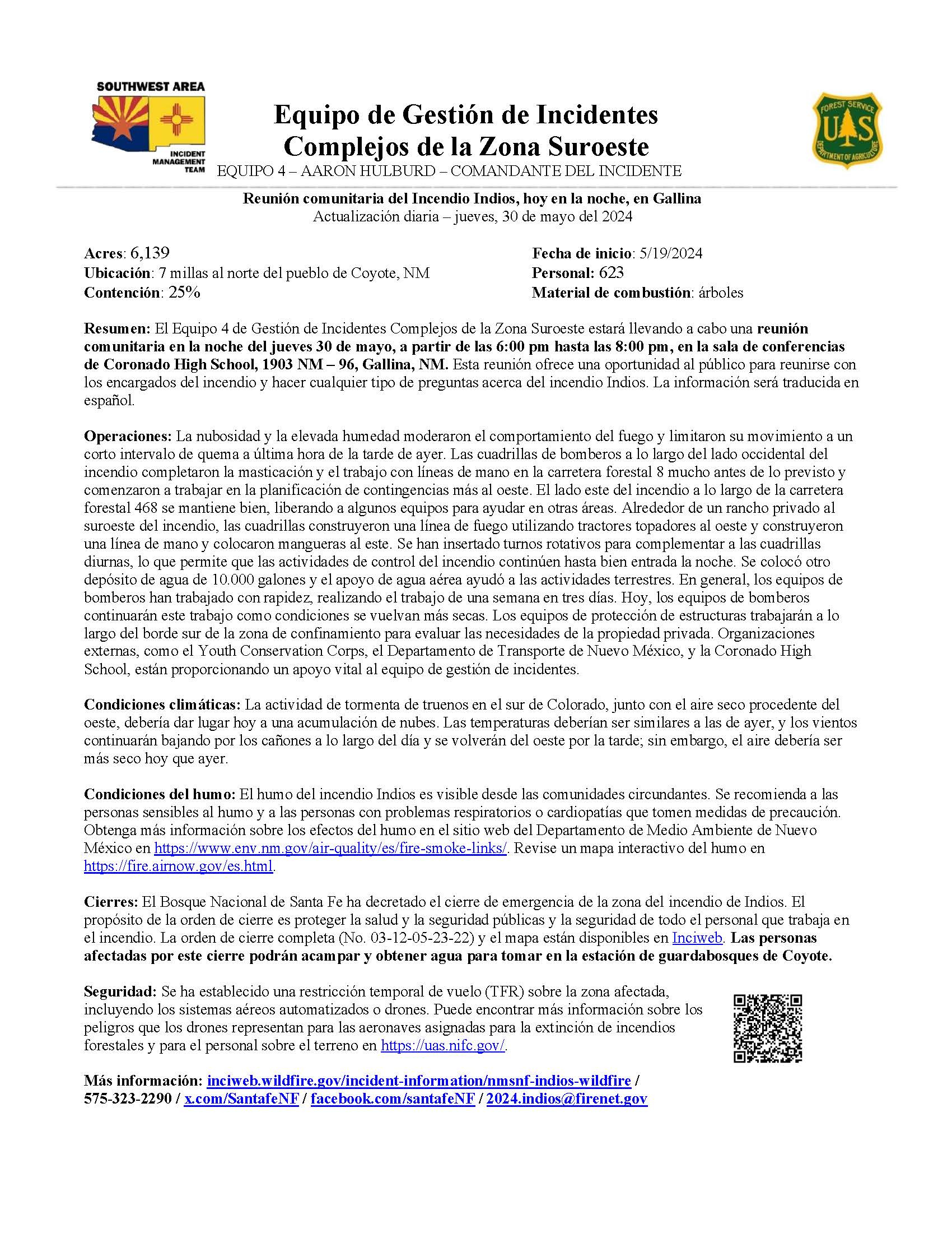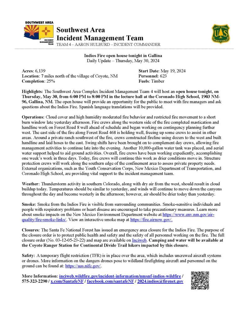 Highlights: The Southwest Area Complex Incident Management Team 4 will host an open house tonight, on Thursday, May 30, from 6:00 PM to 8:00 PM in the lecture hall at the Coronado High School, 1903 NM-96, Gallina, NM. The open house will provide an opportunity for the public to meet with fire managers and ask questions about the Indios Fire. Spanish language translations will be provided.