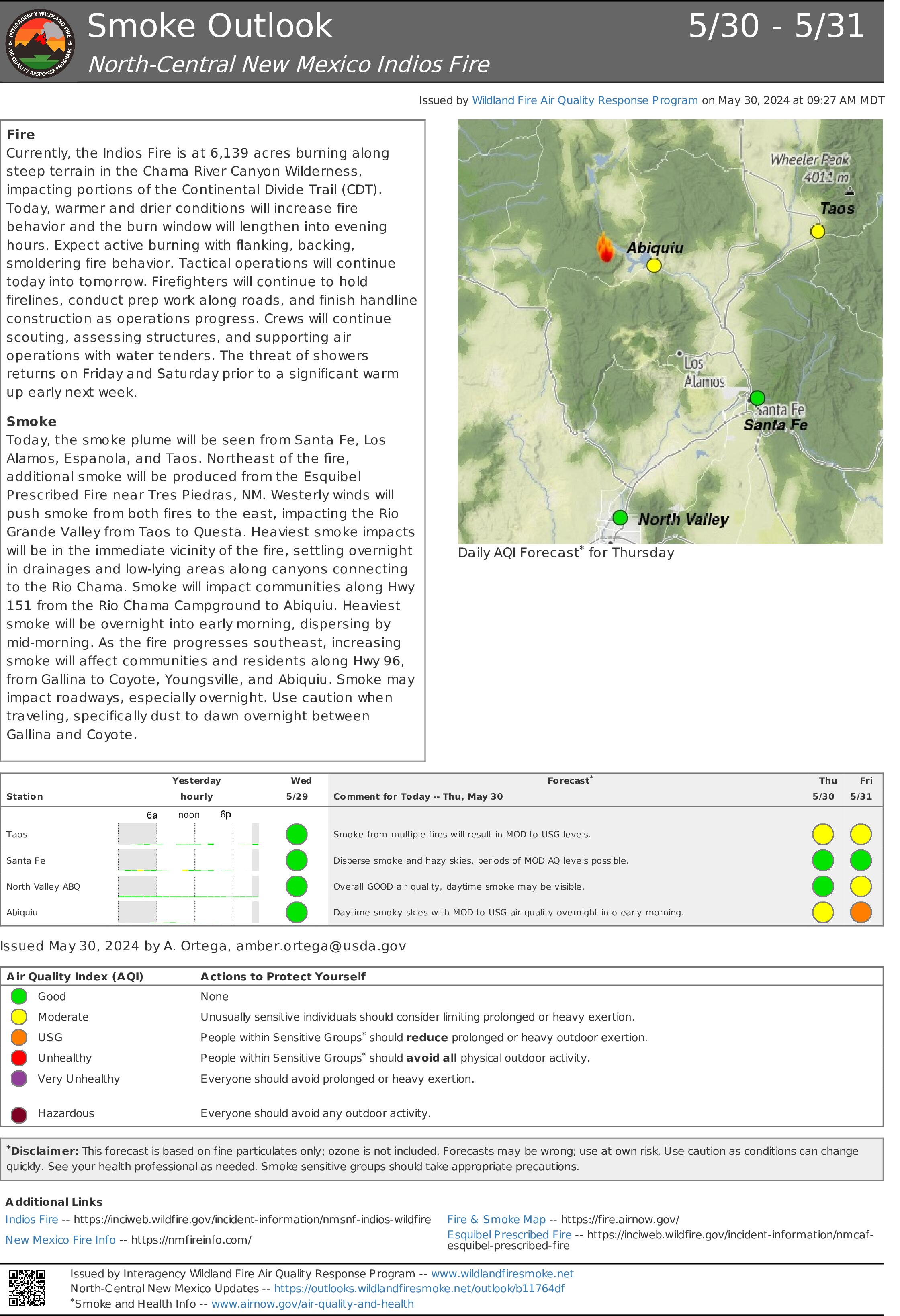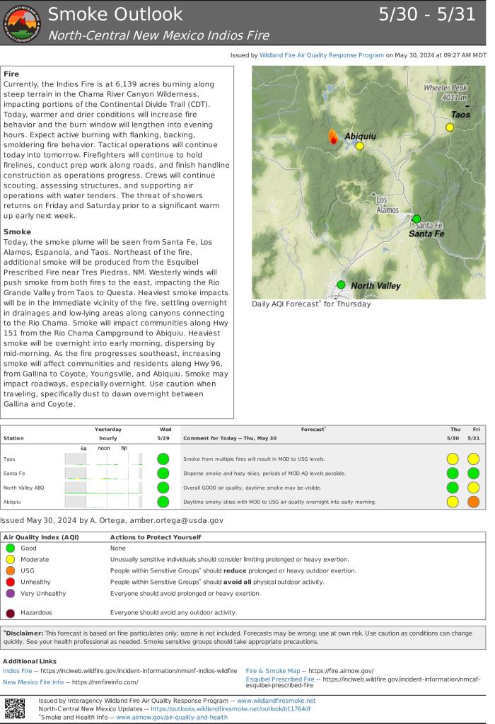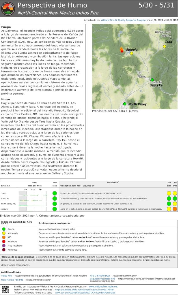Smoke: Smoke from the Indios Fire is visible from surrounding communities. Smoke-sensitive individuals and people with respiratory problems or heart disease are encouraged to take precautionary measures. Learn more about smoke impacts on the New Mexico Environment Department website at https://www.env.nm.gov/air-quality/fire-smoke-links/. View an interactive smoke map at https://fire.airnow.gov/.