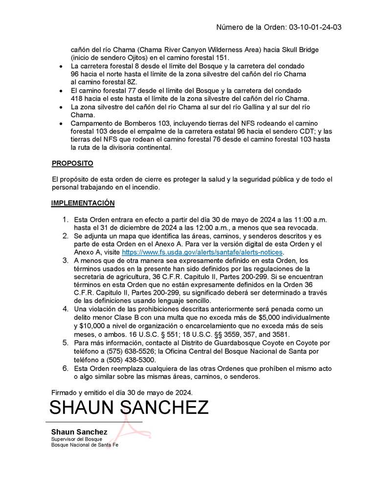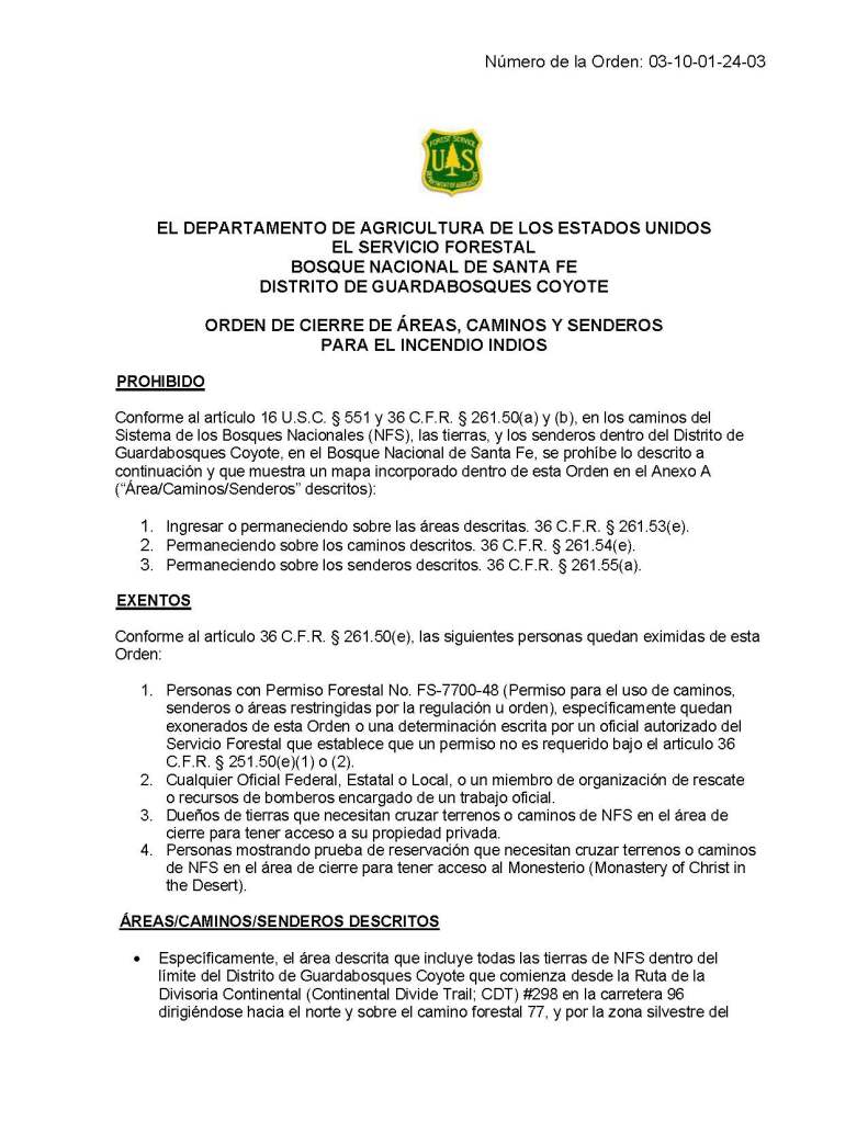 Número de la orden de cierre para el incendio Indios: 03-10-01-24-03, 30 de mayo de 2024