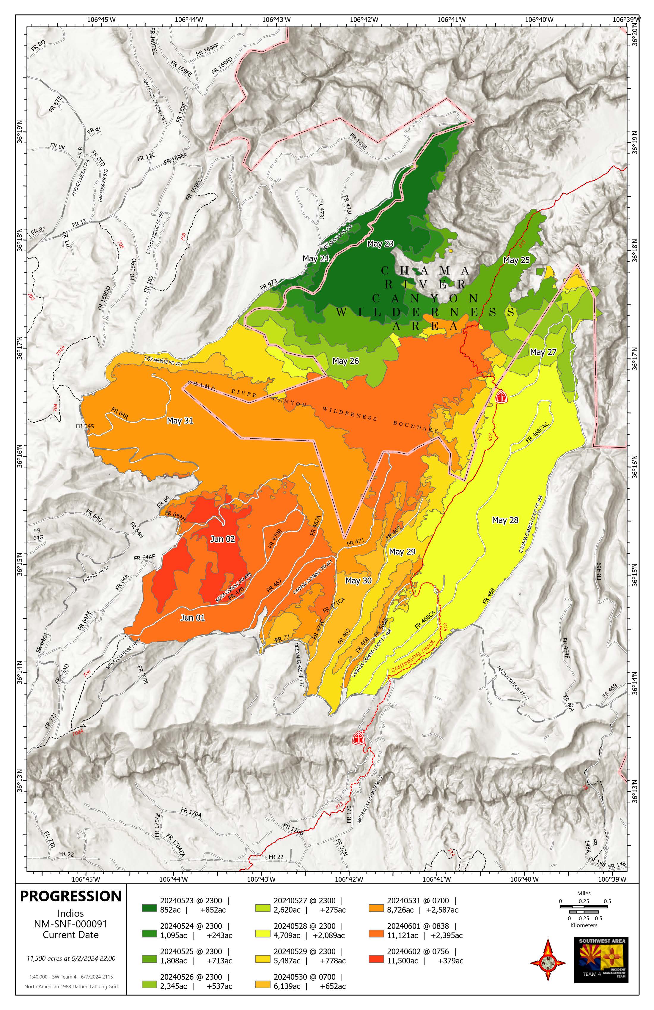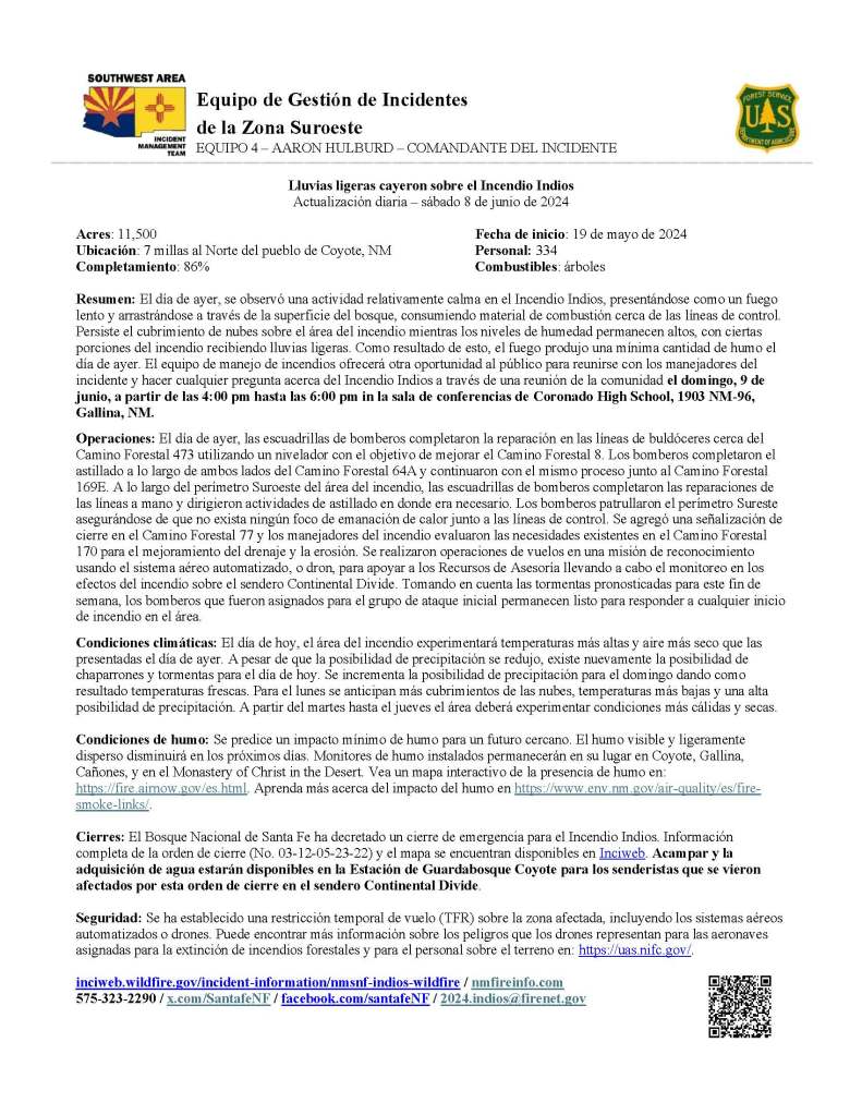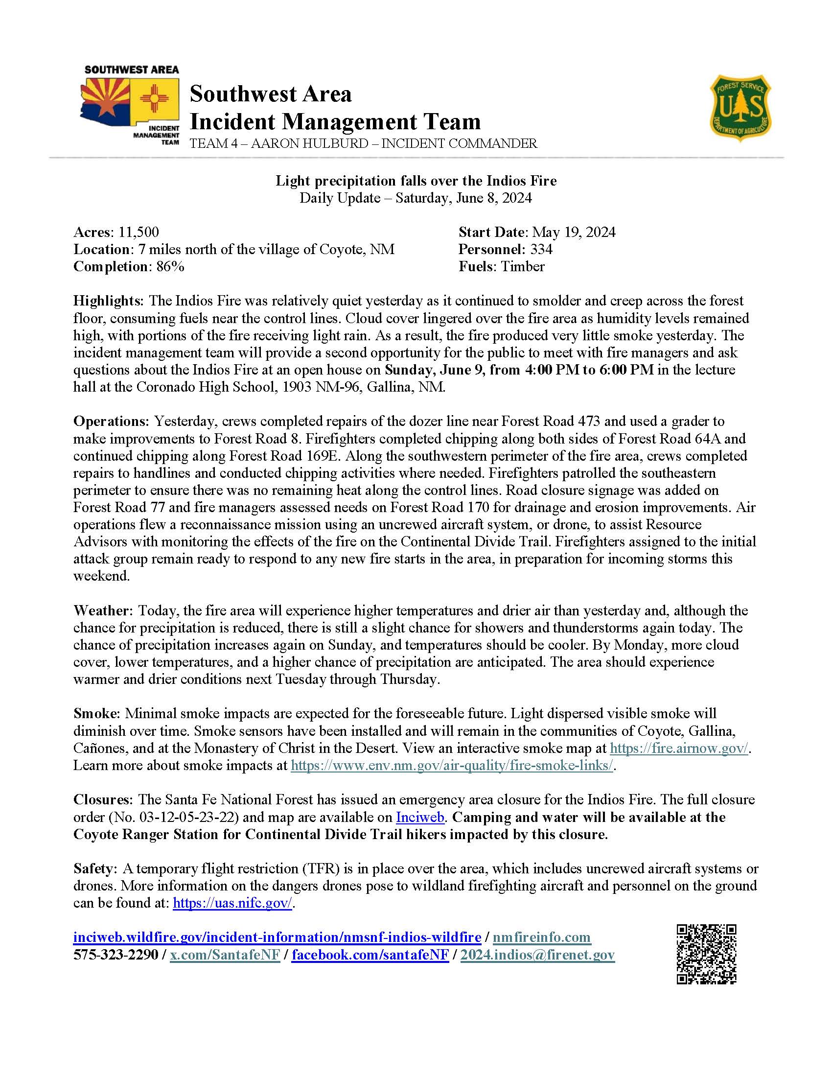 Highlights: The Indios Fire was relatively quiet yesterday as it continued to smolder and creep across the forest floor, consuming fuels near the control lines. Cloud cover lingered over the fire area as humidity levels remained high, with portions of the fire receiving light rain. As a result, the fire produced very little smoke yesterday. The incident management team will provide a second opportunity for the public to meet with fire managers and ask questions about the Indios Fire at an open house on Sunday, June 9, from 4:00 PM to 6:00 PM in the lecture hall at the Coronado High School, 1903 NM-96, Gallina, NM.