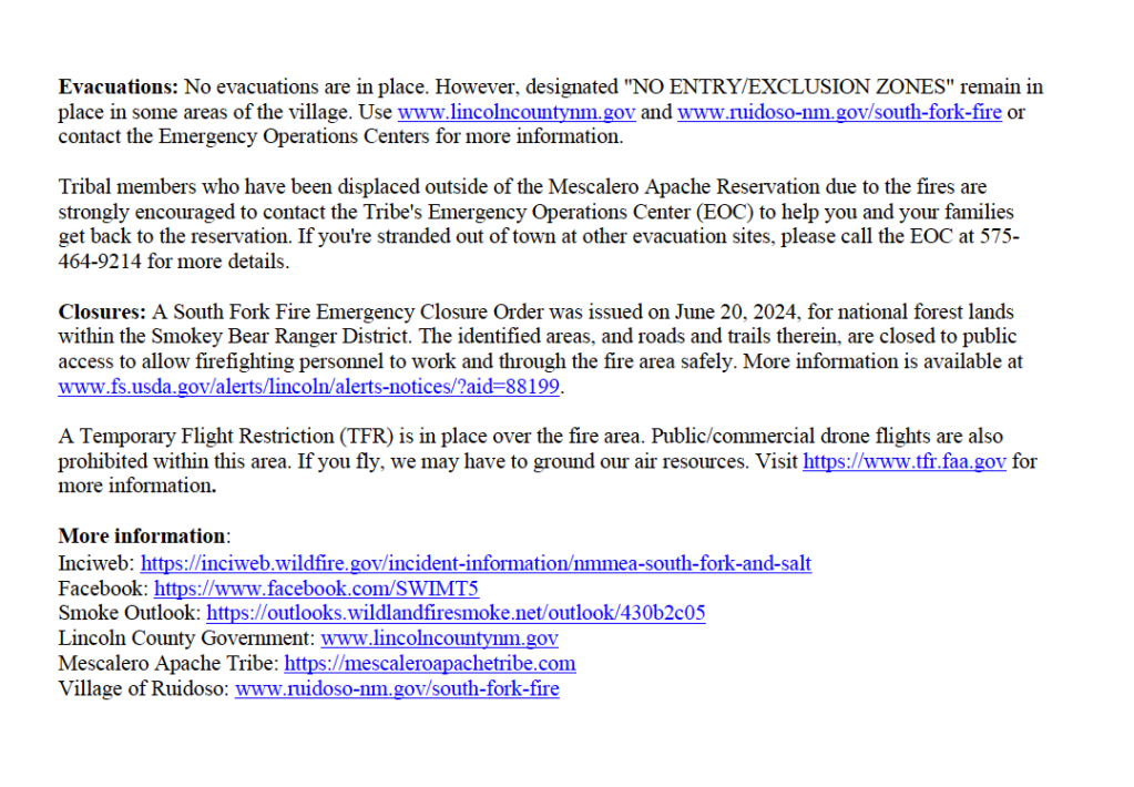 Evacuations: No evacuations are in place. However, designated “NO ENTRY/EXCLUSION ZONES” remain in place in some areas of the village. Use www.lincolncountynm.gov and www.ruidoso-nm.gov/south-fork-fire or contact the Emergency Operations Centers for more information.