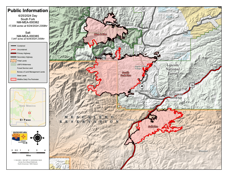 Closures: A South Fork Fire Emergency Closure Order was issued on June 20, 2024, for national forest lands within the Smokey Bear Ranger District. The identified areas, and roads and trails therein, are closed to public access to allow firefighting personnel to work and through the fire area safely. More information is available at www.fs.usda.gov/alerts/lincoln/alerts-notices/?aid=88199.