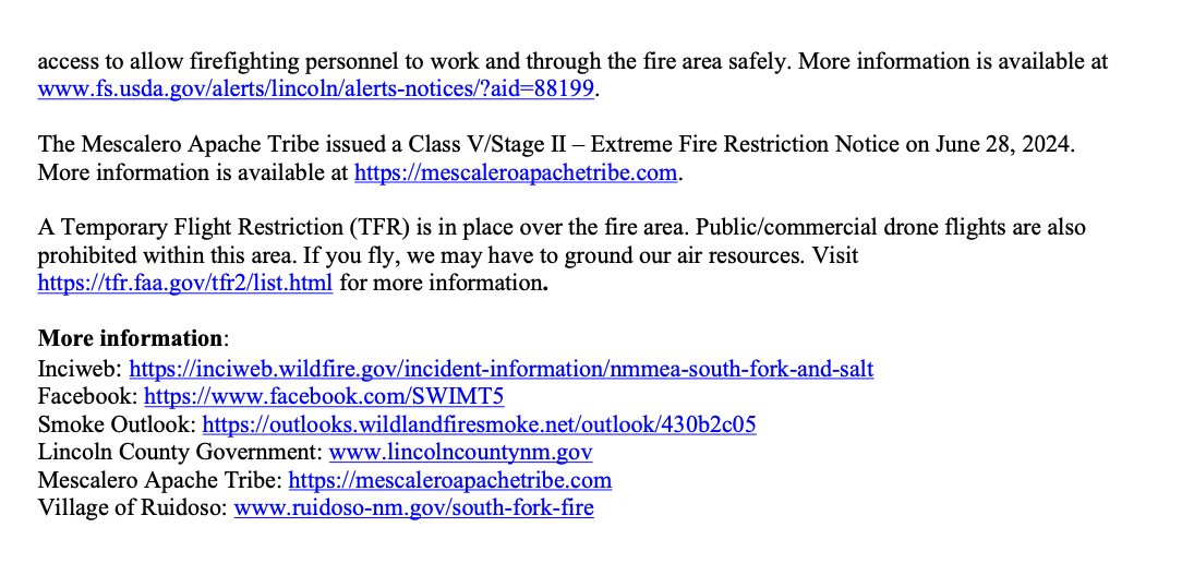 The Mescalero Apache Tribe issued a Class V/Stage II – Extreme Fire Restriction Notice on June 28, 2024. More information is available at https://mescaleroapachetribe.com.