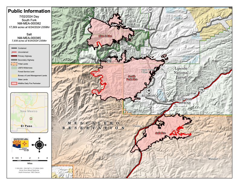 Closures: A South Fork Fire Emergency Closure Order was issued on June 20, 2024, for national forest lands within the Smokey Bear Ranger District. The identified areas, and roads and trails therein, are closed to public access to allow firefighting personnel to work and through the fire area safely. More information is available at www.fs.usda.gov/alerts/lincoln/alerts-notices/?aid=88199.