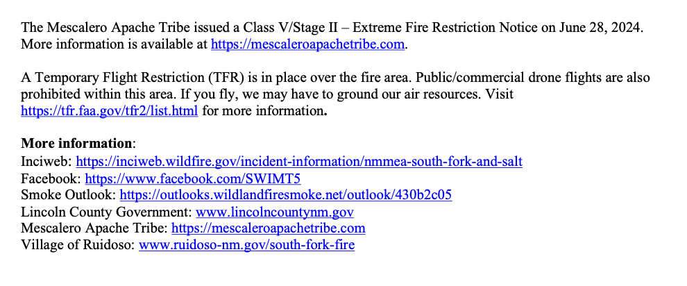 The Mescalero Apache Tribe issued a Class V/Stage II – Extreme Fire Restriction Notice on June 28, 2024. More information is available at https://mescaleroapachetribe.com.