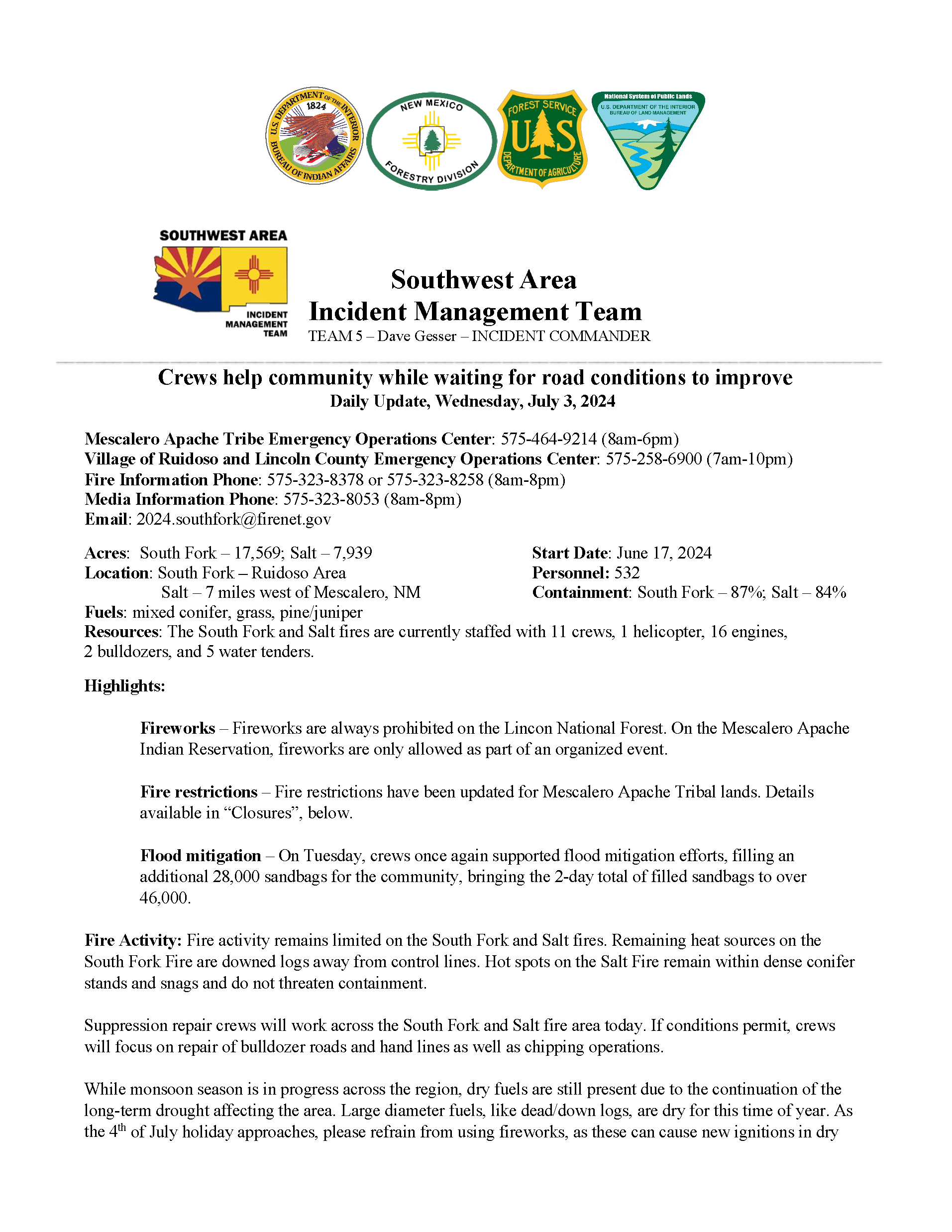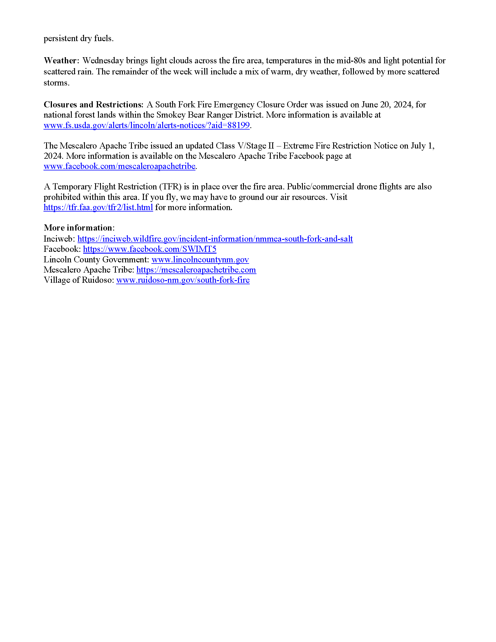 Closures and Restrictions: A South Fork Fire Emergency Closure Order was issued on June 20, 2024, for national forest lands within the Smokey Bear Ranger District. More information is available at www.fs.usda.gov/alerts/lincoln/alerts-notices/?aid=88199.