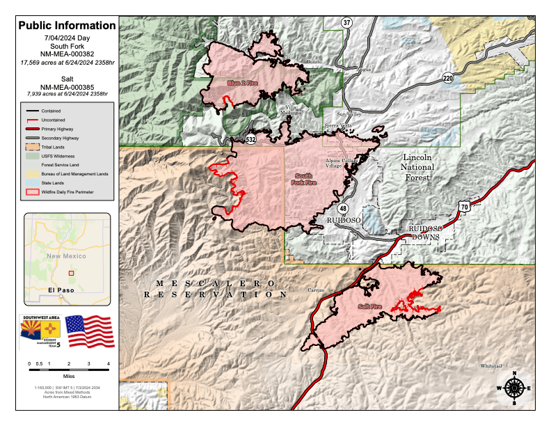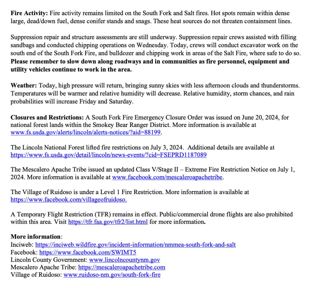 Going forward, to obtain information about the South Fork and Salt Fires, please contact the following agencies: Mescalero Apache Tribe at 575-464-4494; Lincoln National Forest at 575-270-2726 and/or New Mexico State Forestry Division at 505-699-0601.